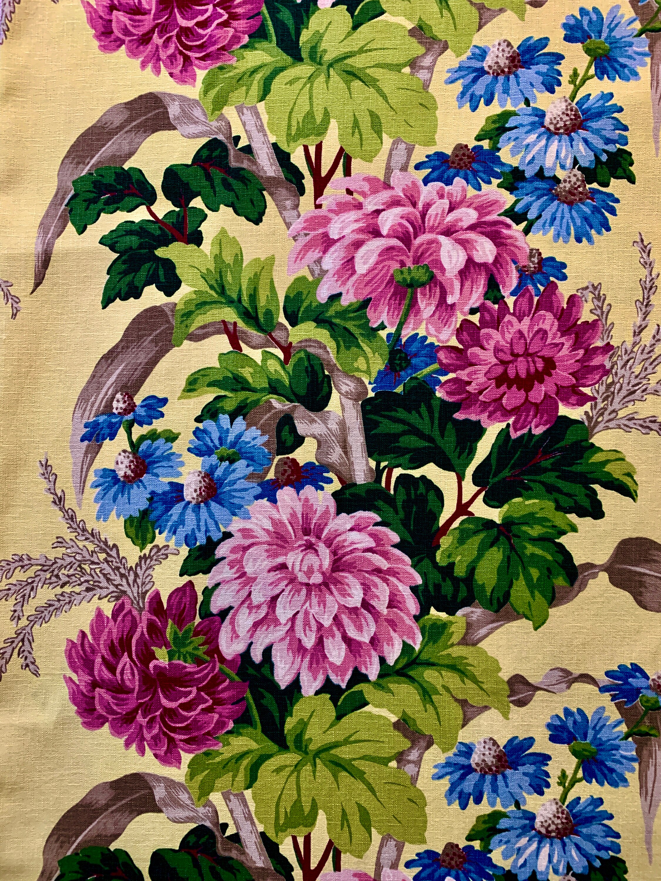The lemon yellow ground complements this striking floral design, with a linen weave which adds interest.