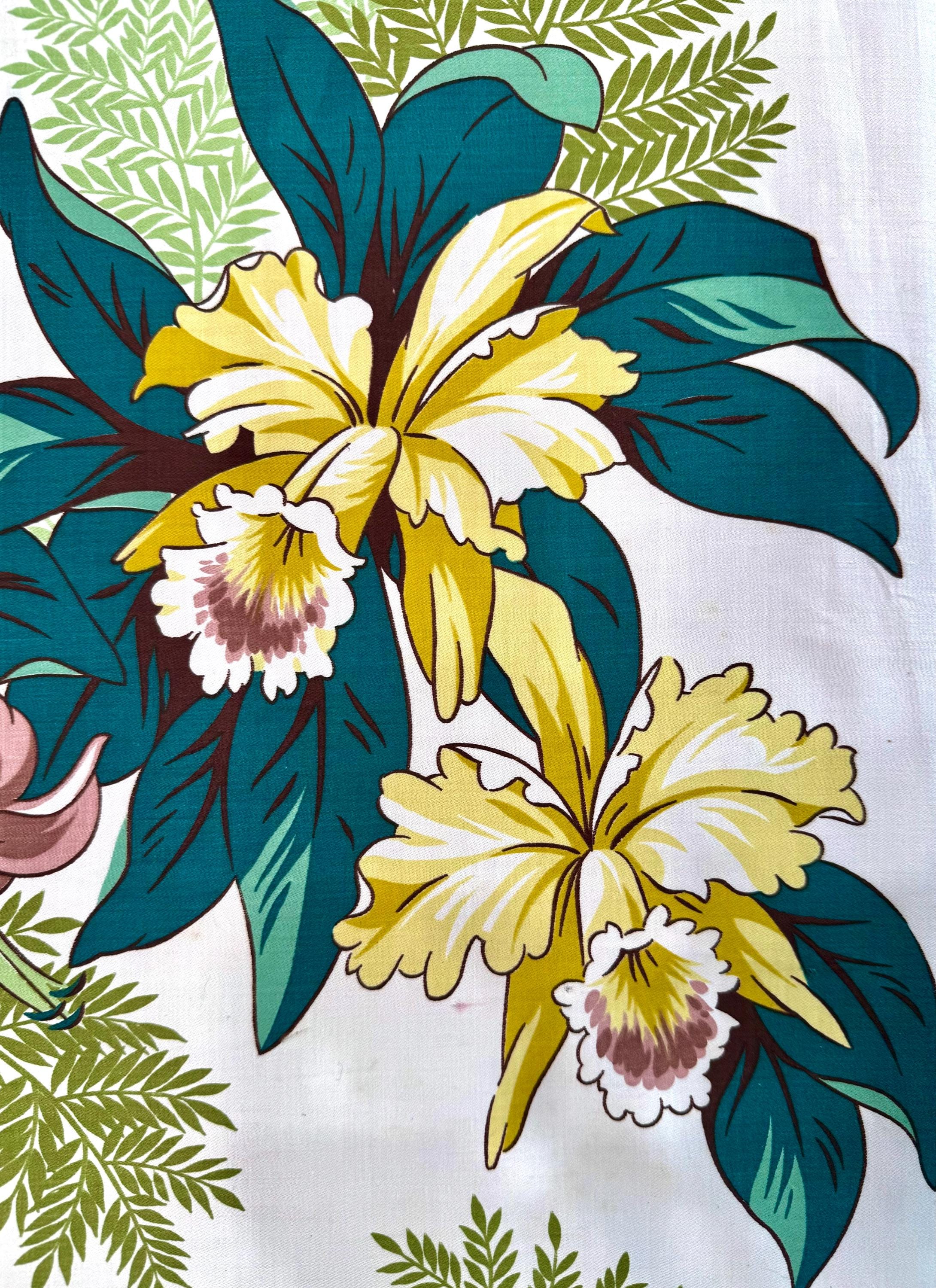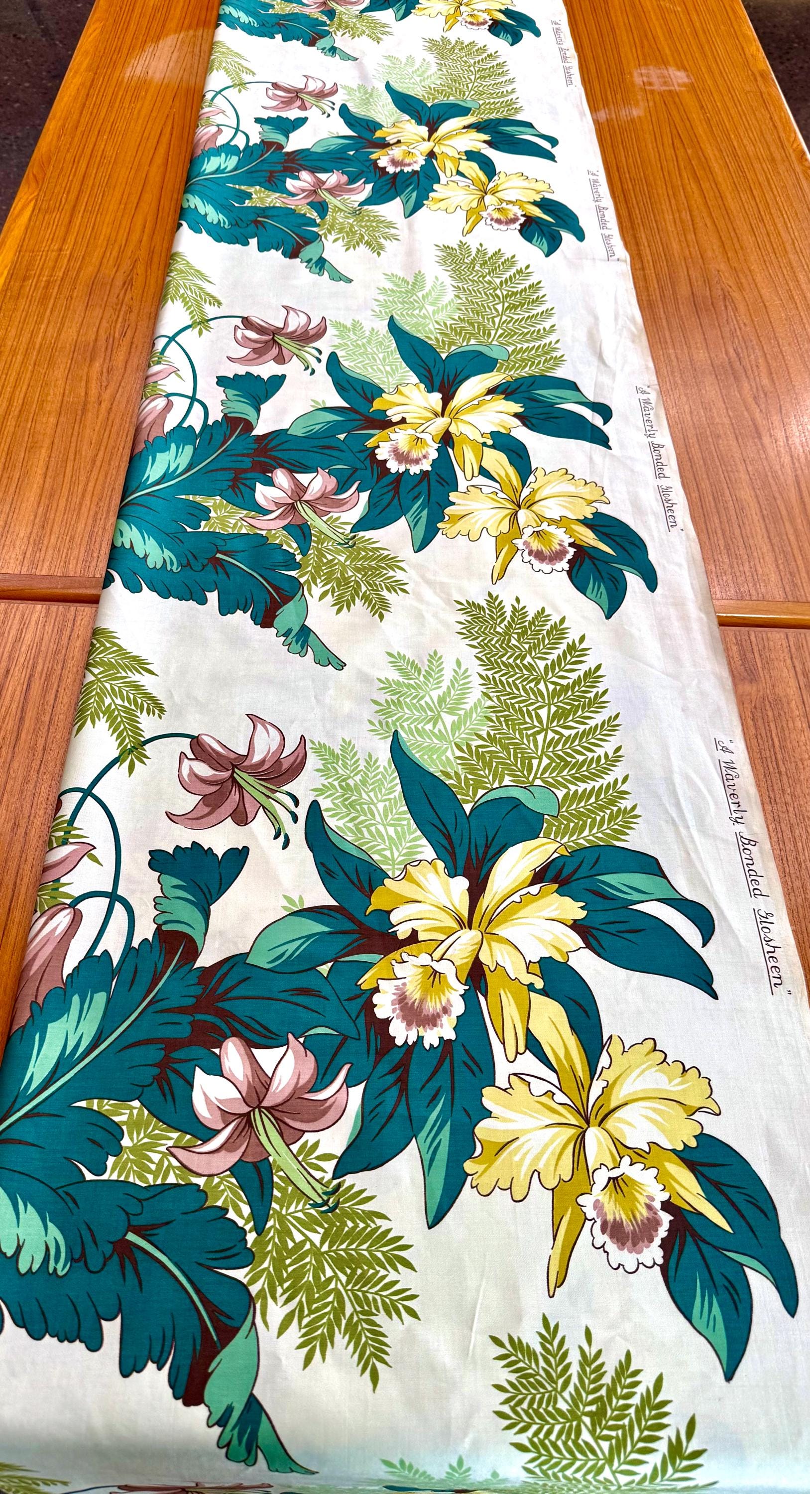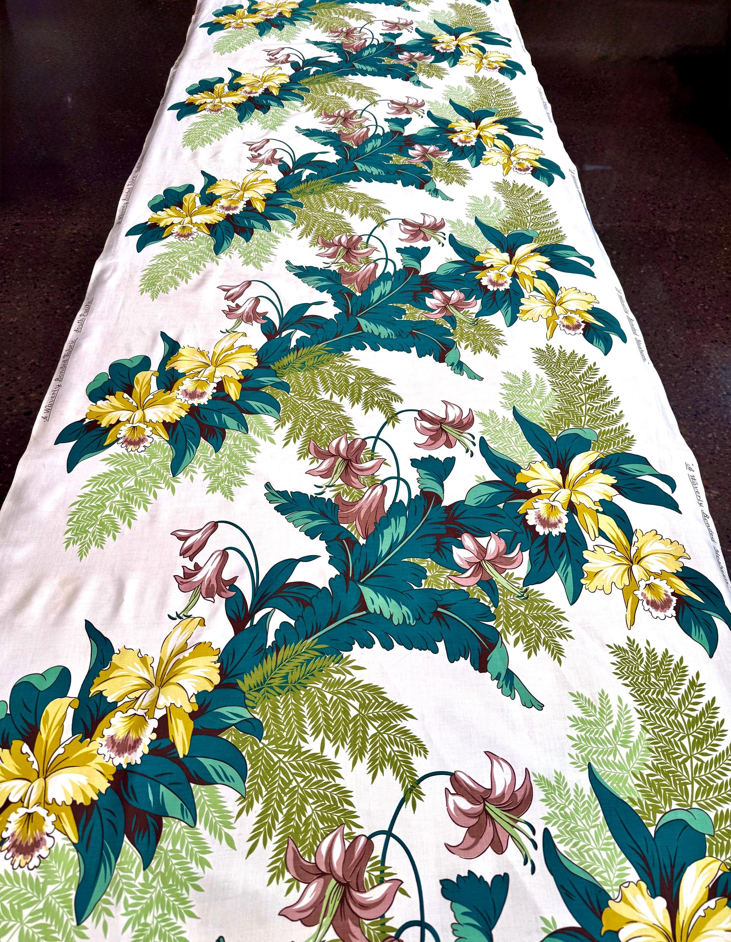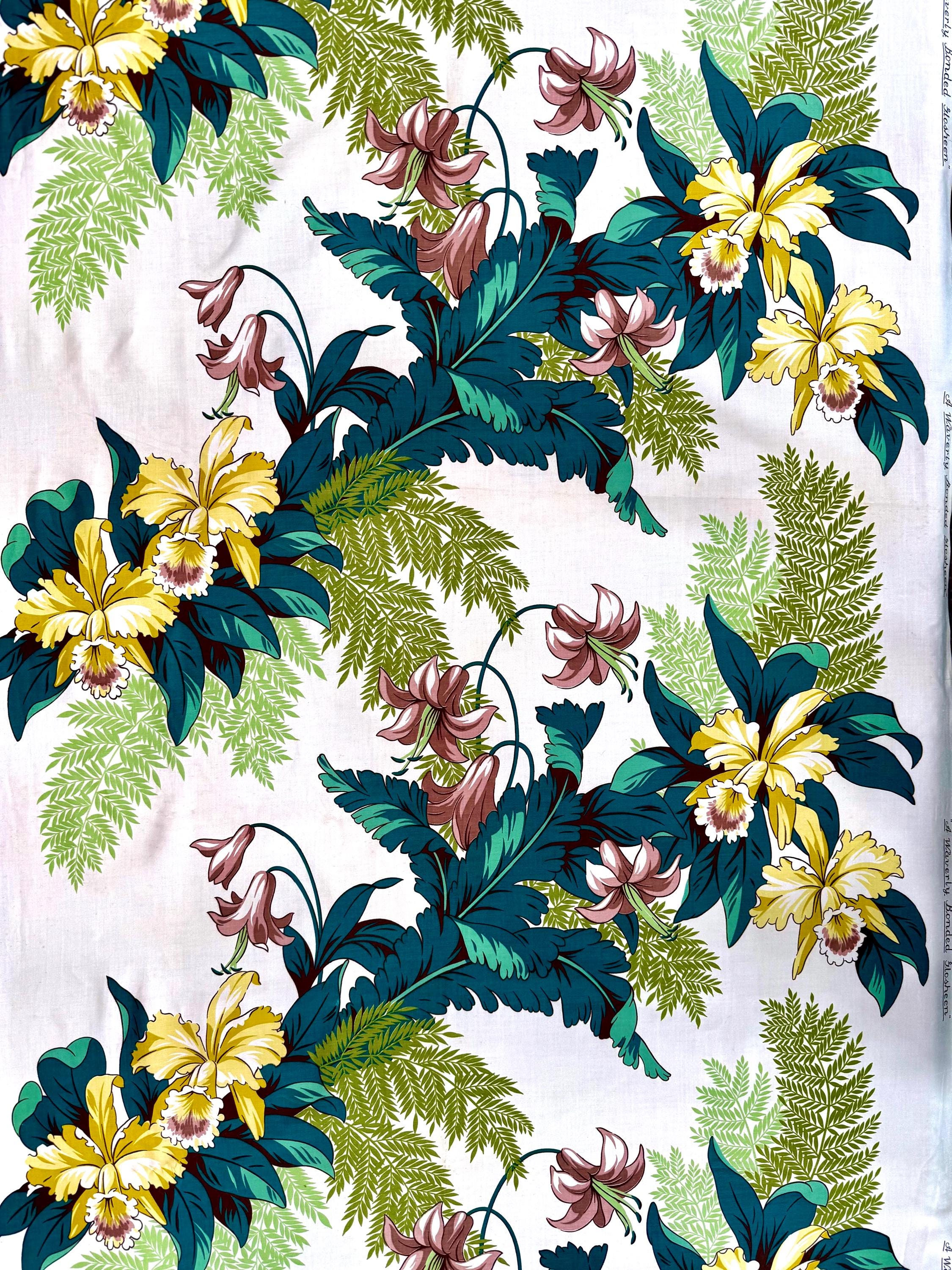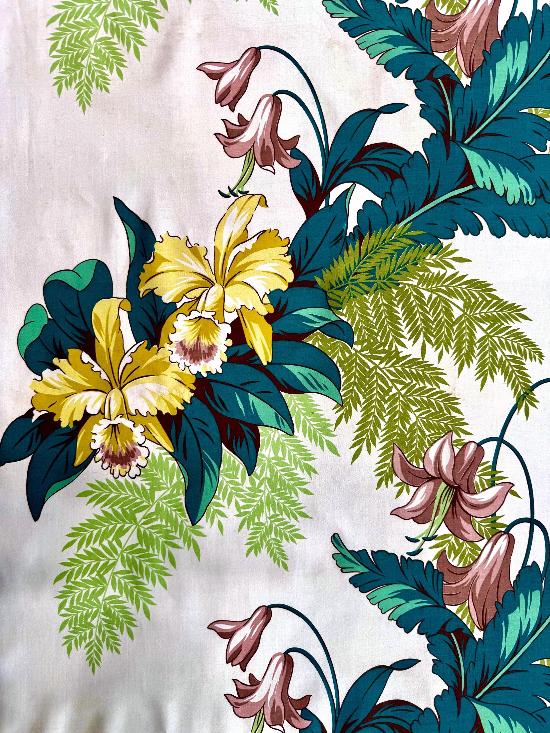 This fabric sports spectacular gold and white Orchids and espresso and taupe colored Lillies with celadon green stamens.
