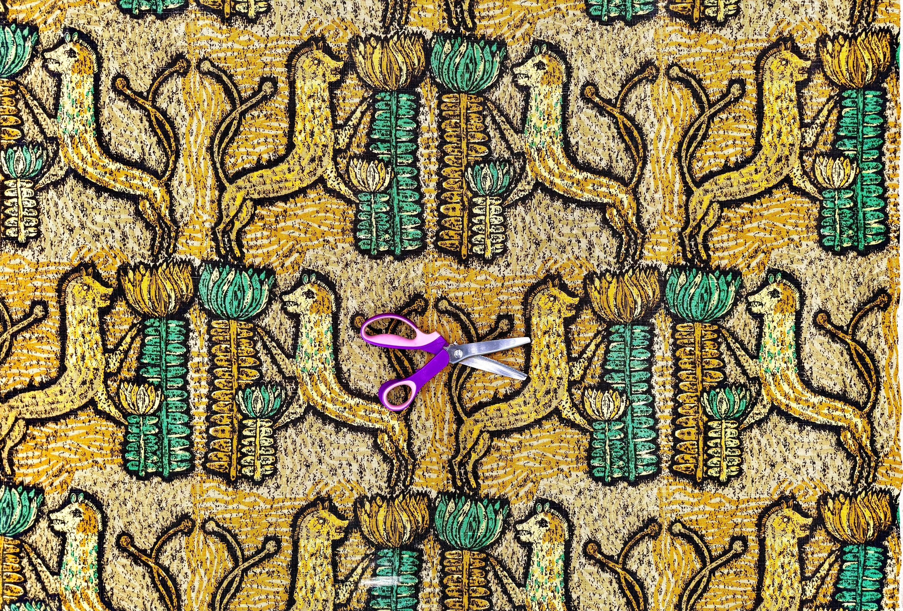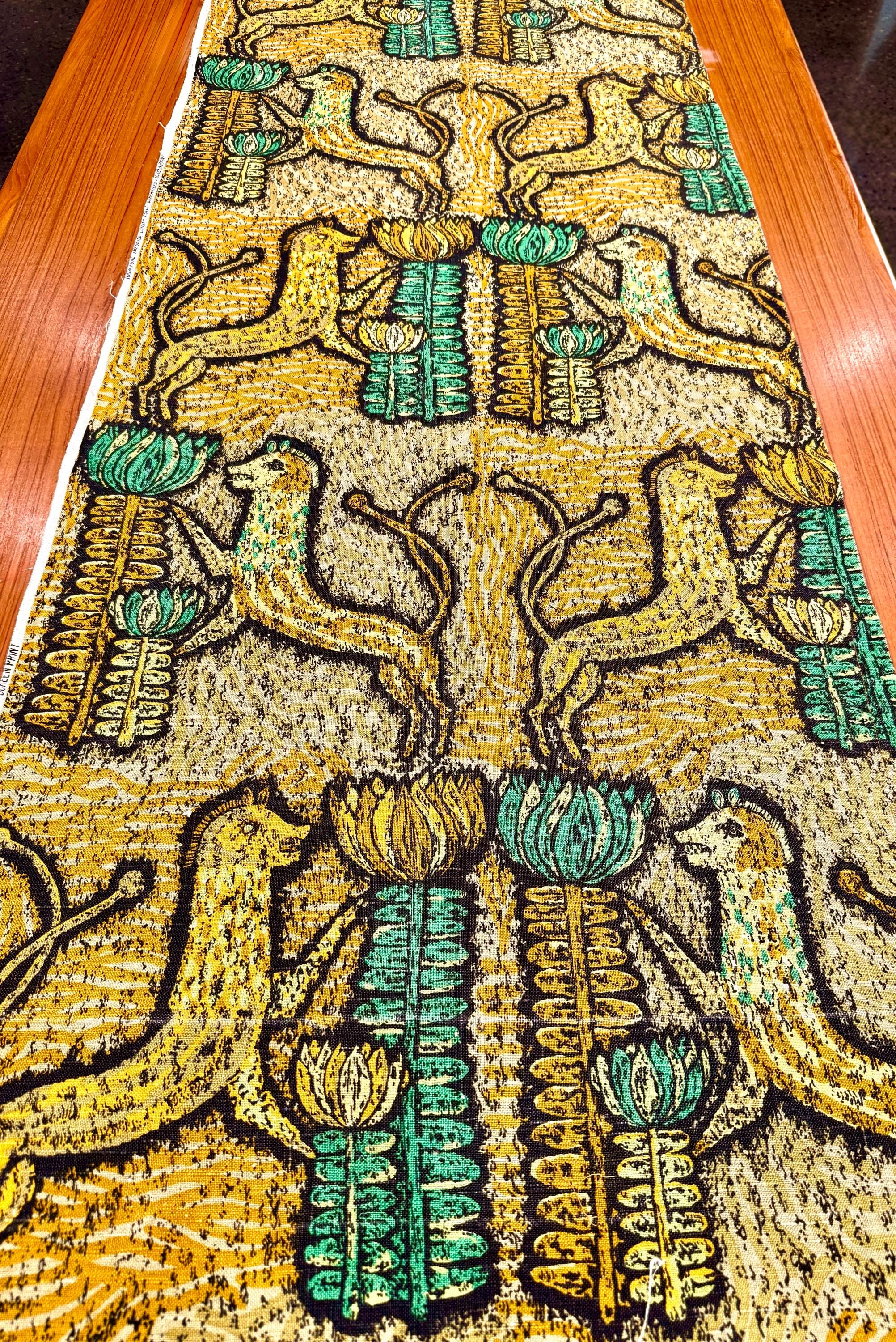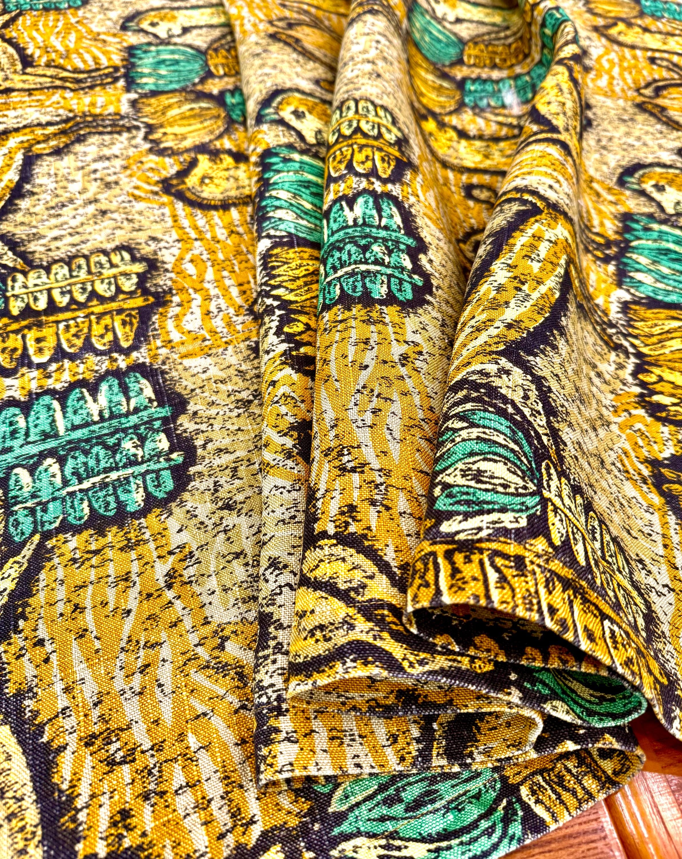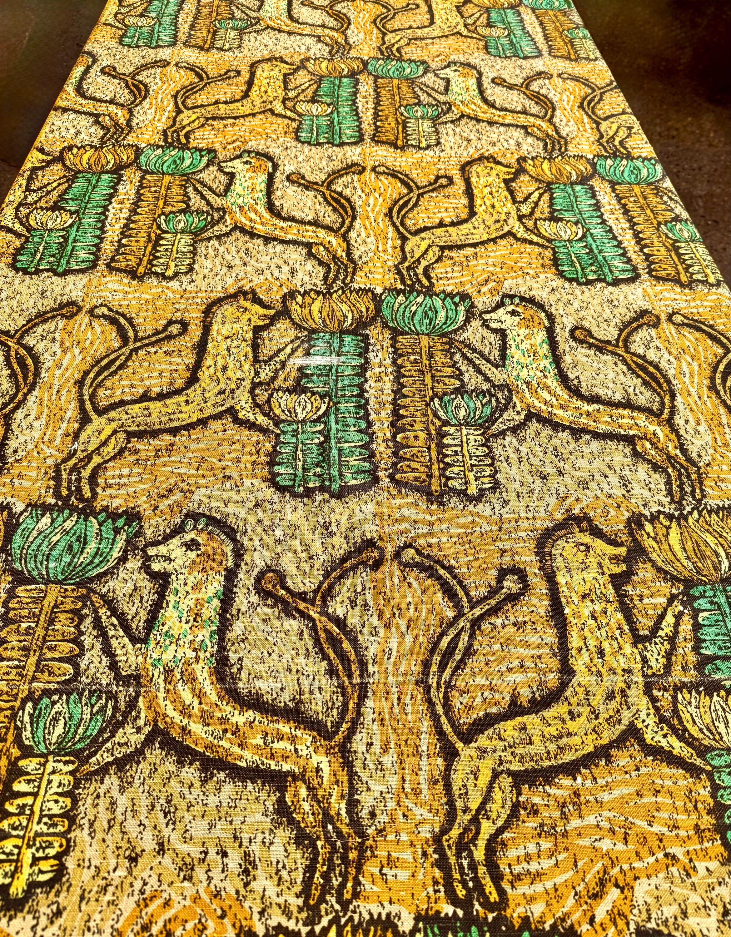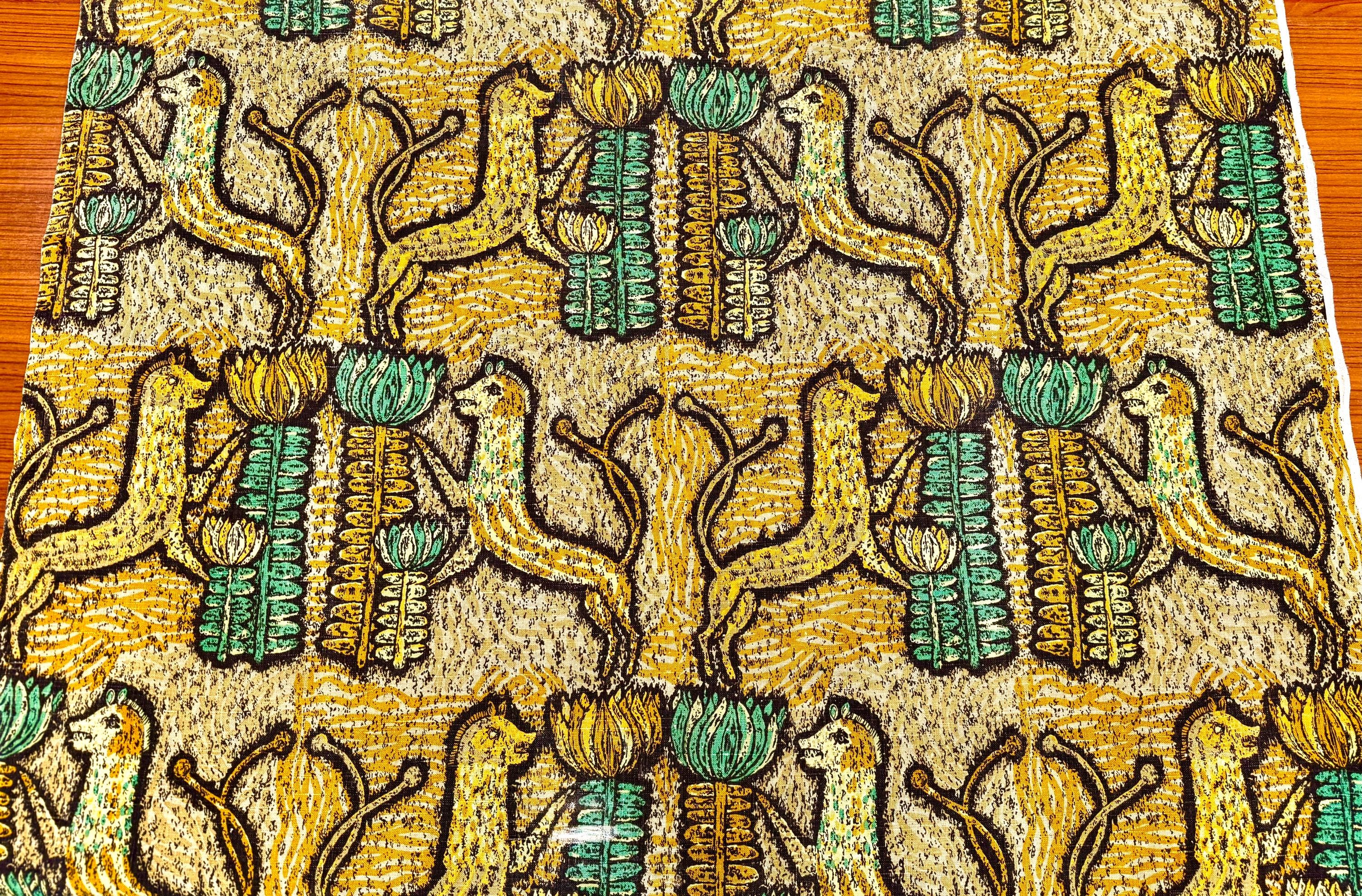 This amazing fabric, in vivid yellow, green, and black, features stylized lions and lotus flowers with a design that looks like the family crest of a medieval dynasty.
