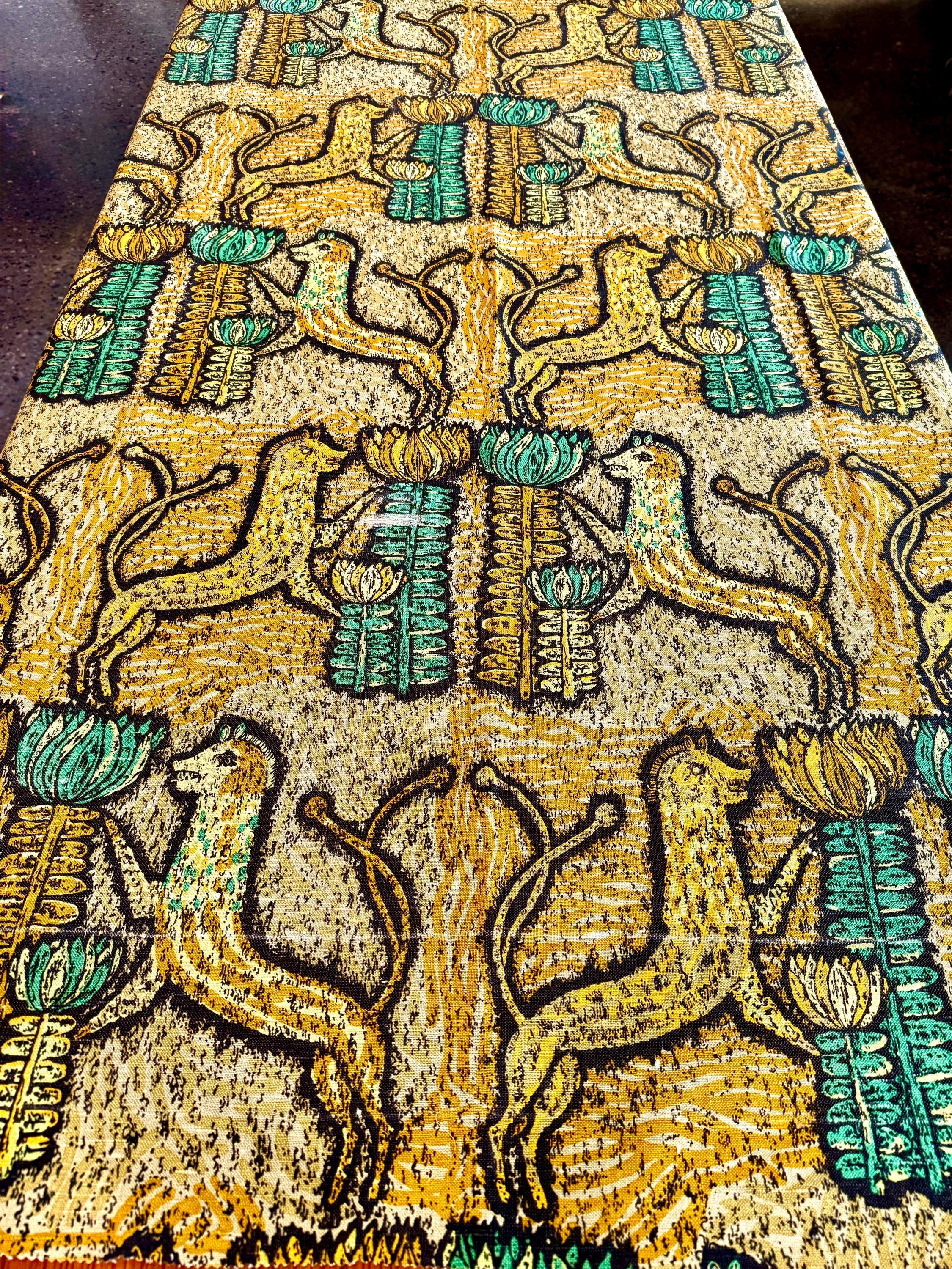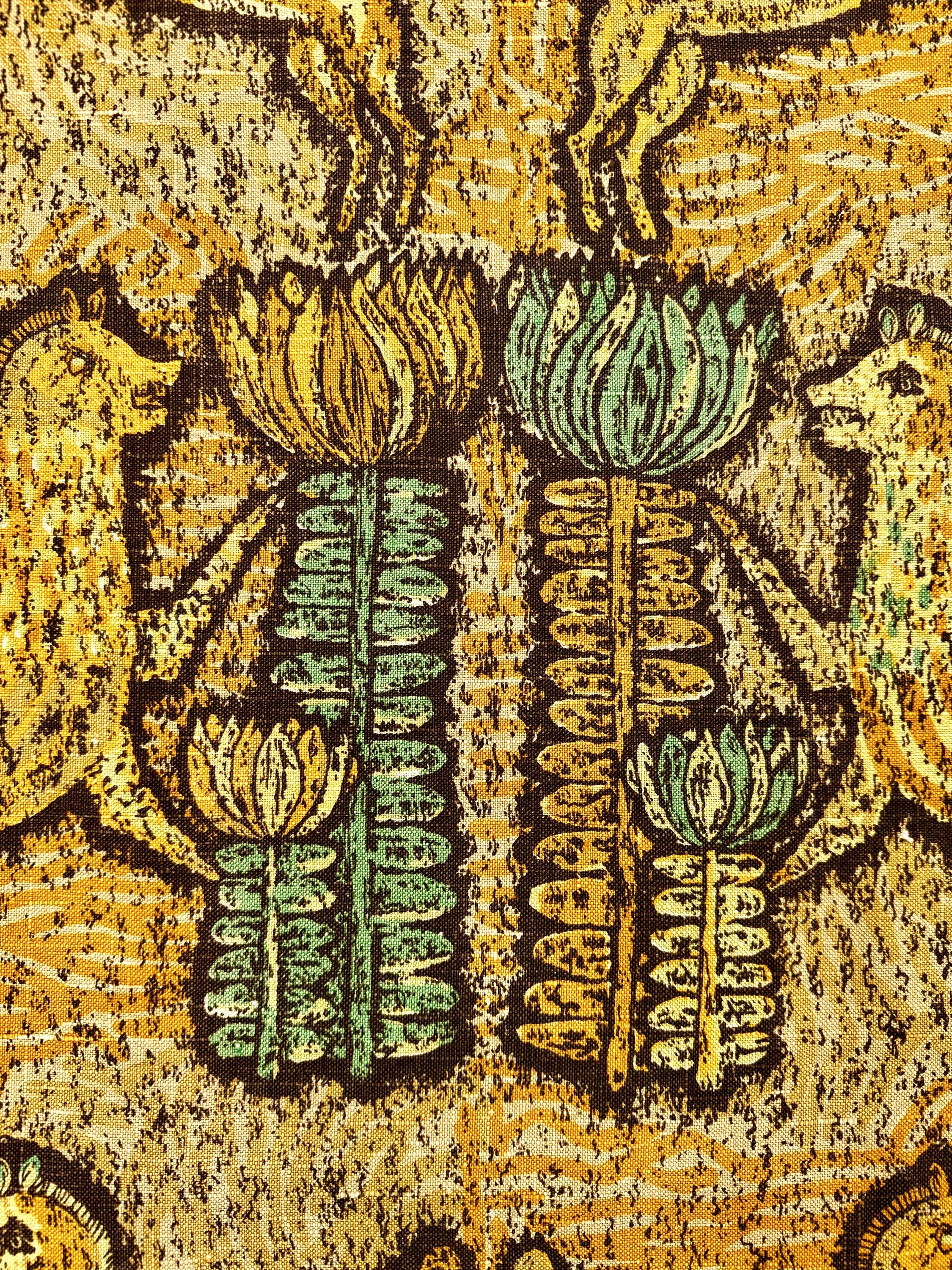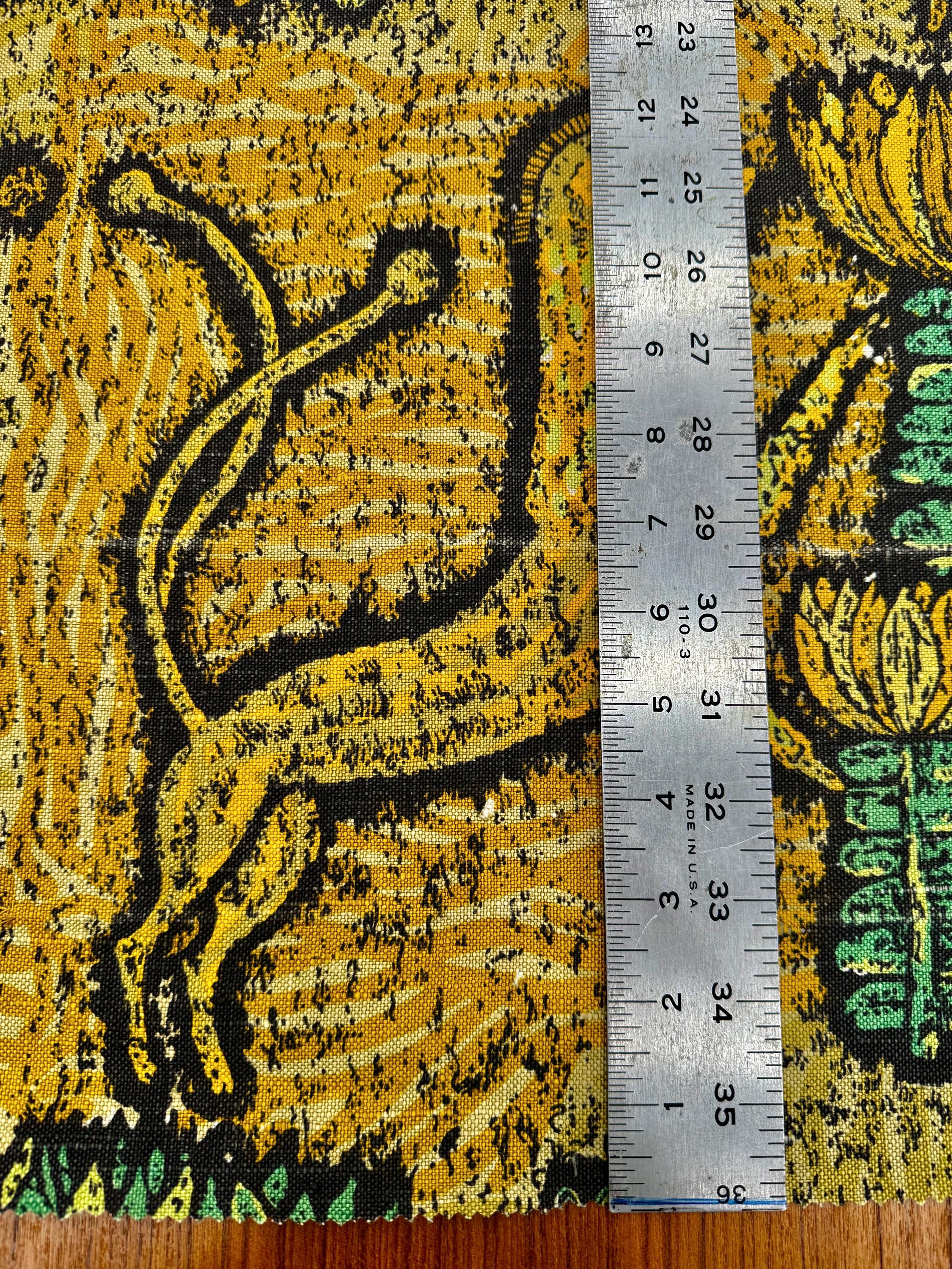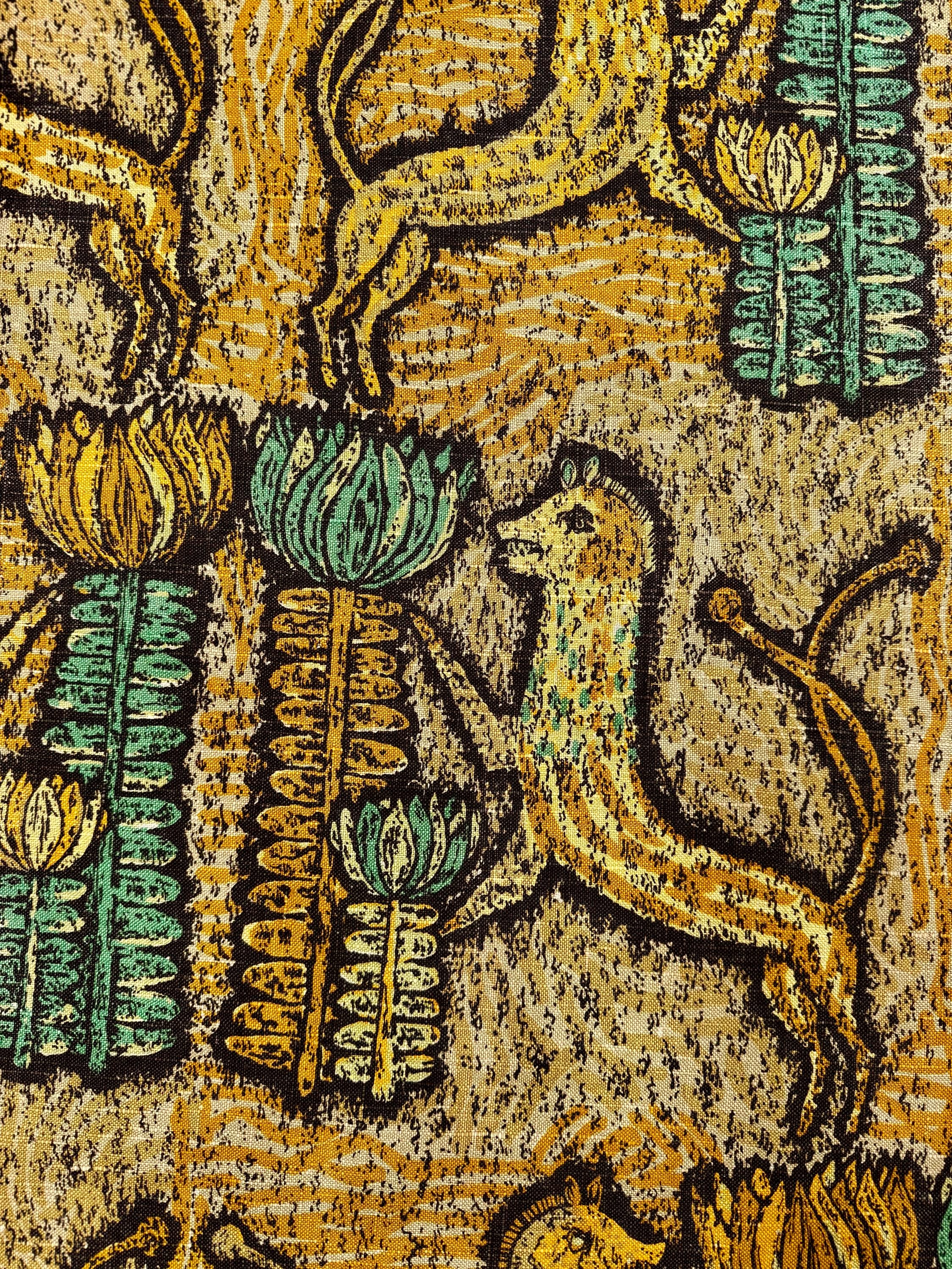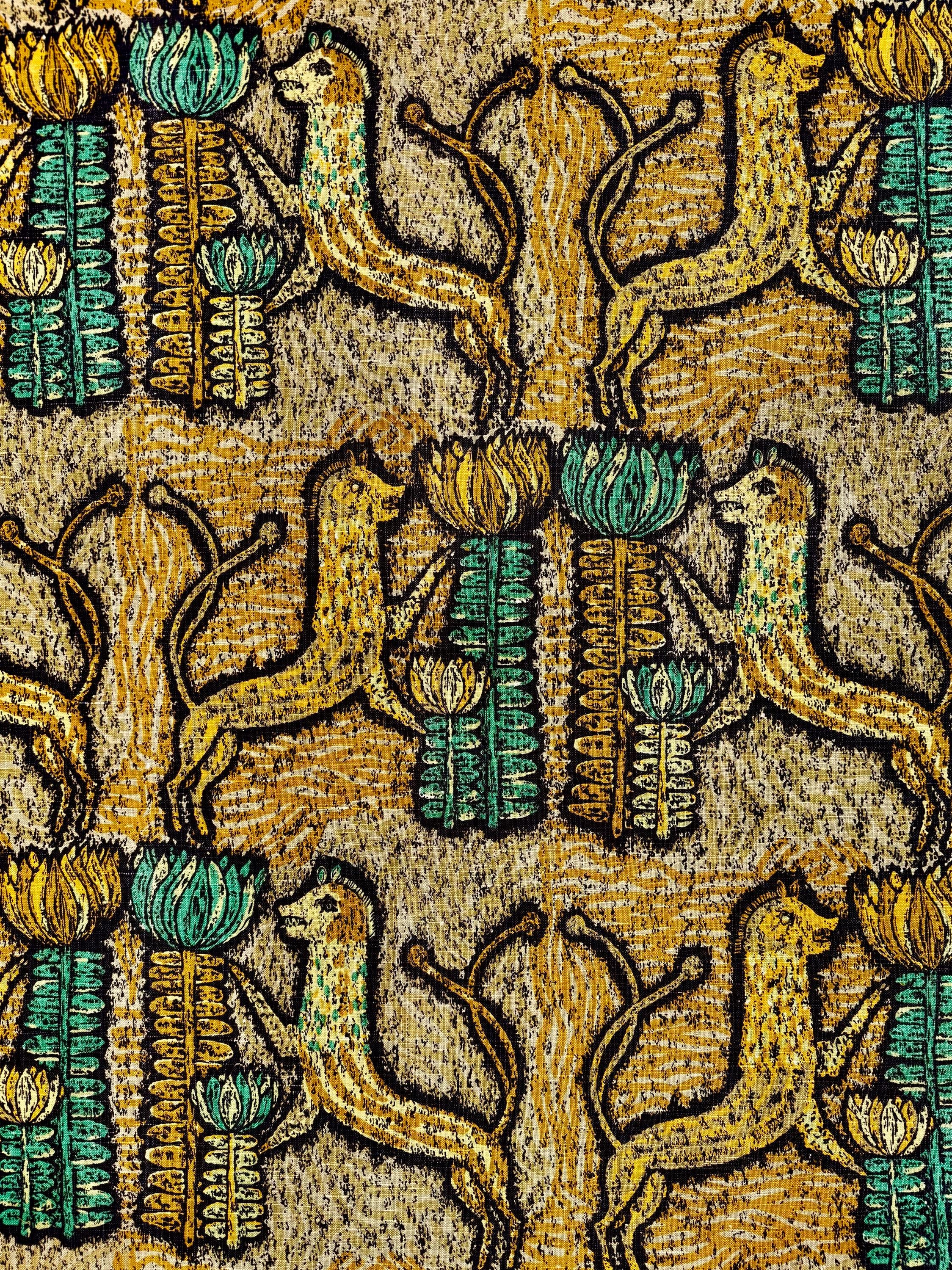 This amazing fabric, in vivid yellow, green, and black, features stylized lions and lotus flowers with a design that looks like the family crest of a medieval dynasty.