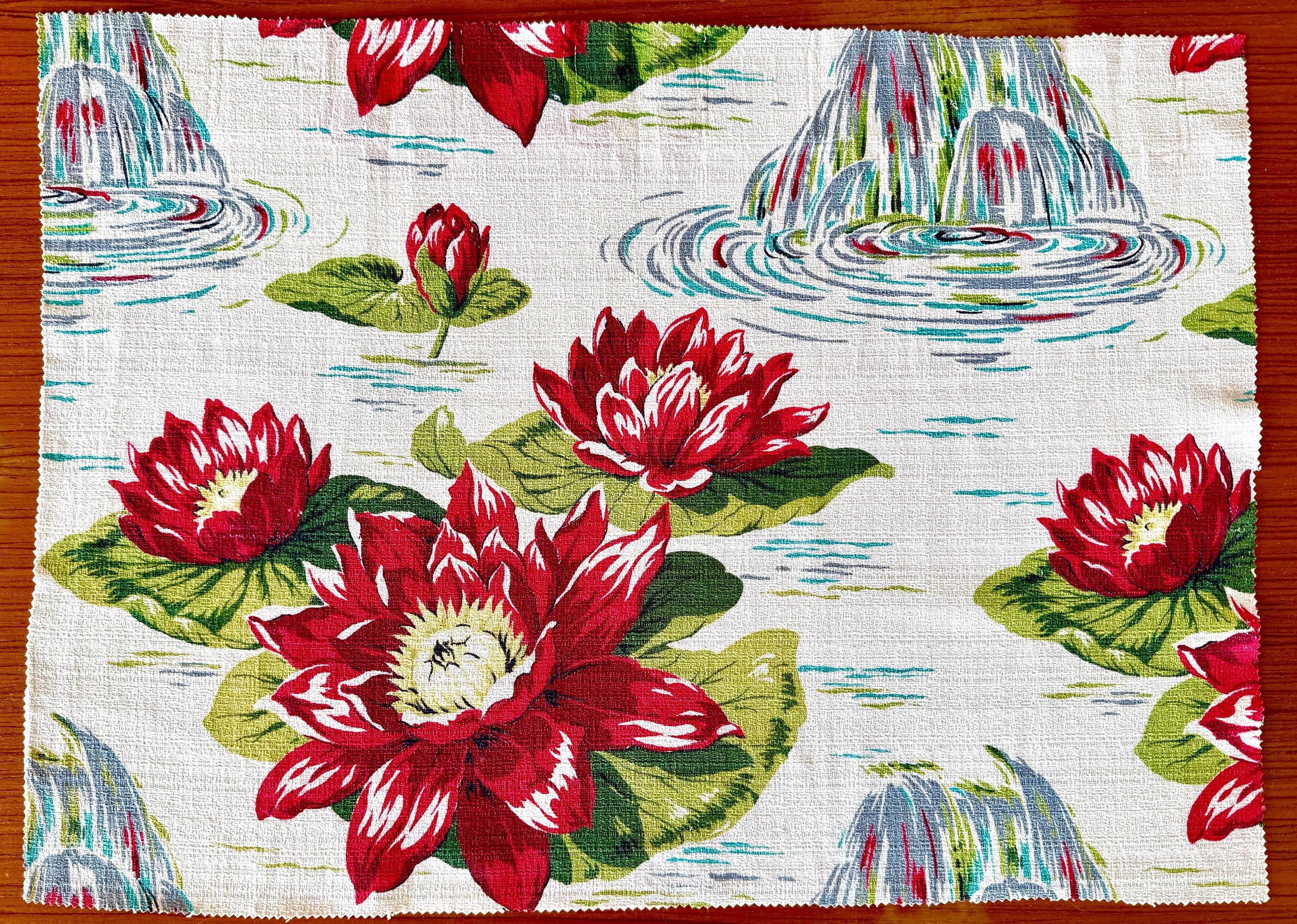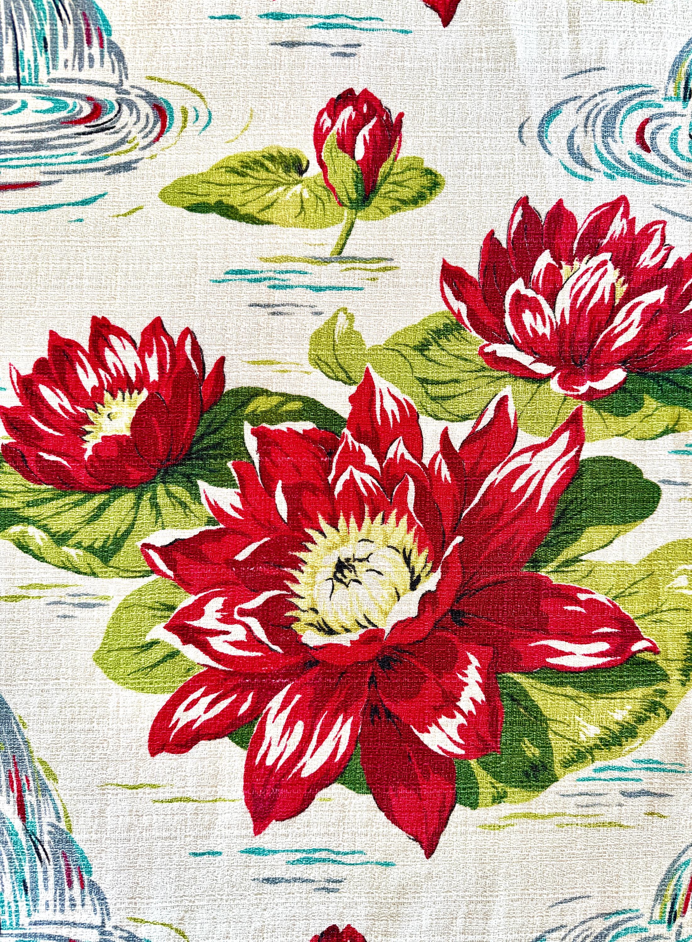 Stunning waterlilies in a striking color palate featuring red and white blooms with a sunny yellow center, and pine and lime green leaves, take center stage on this fab floral pattern.