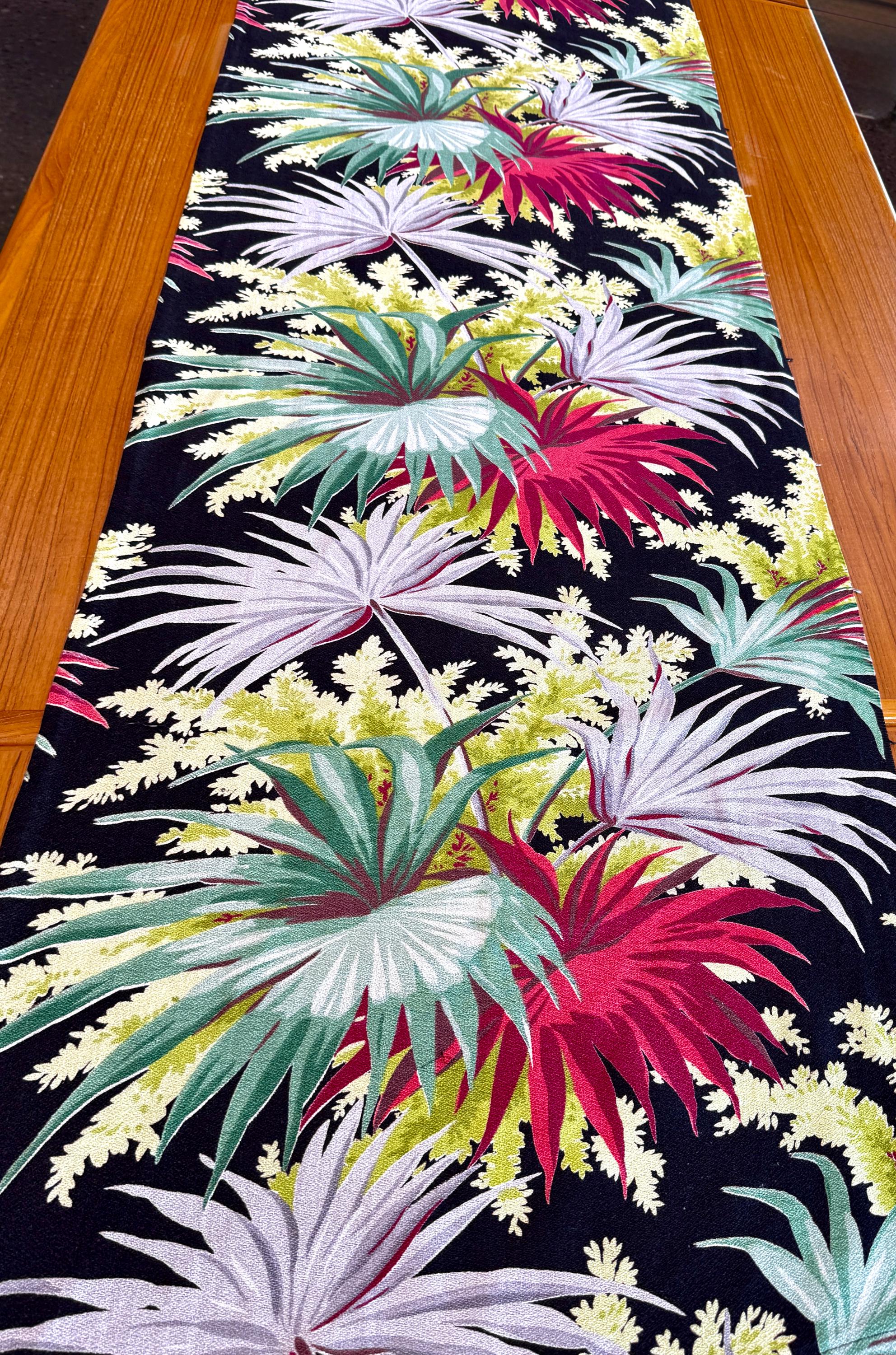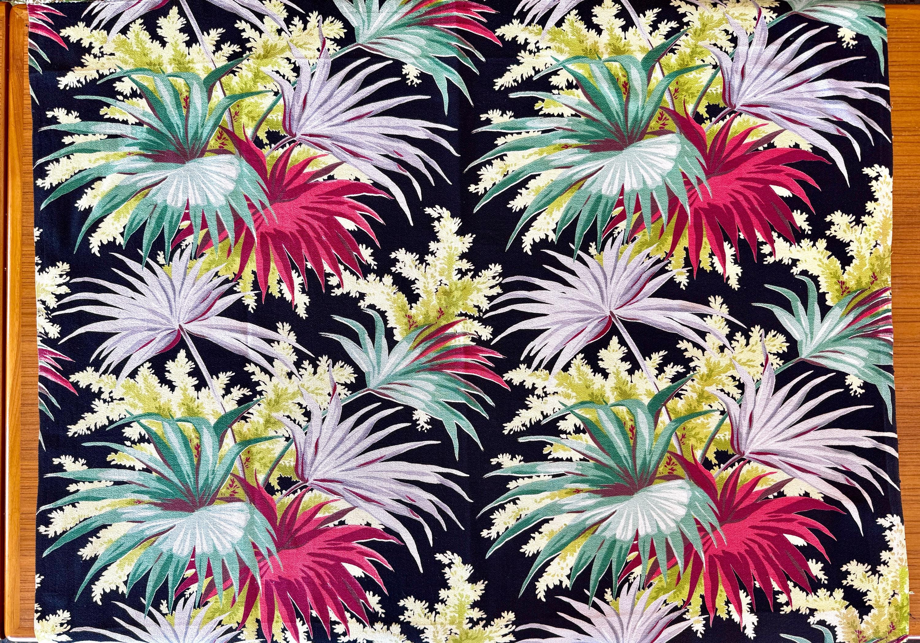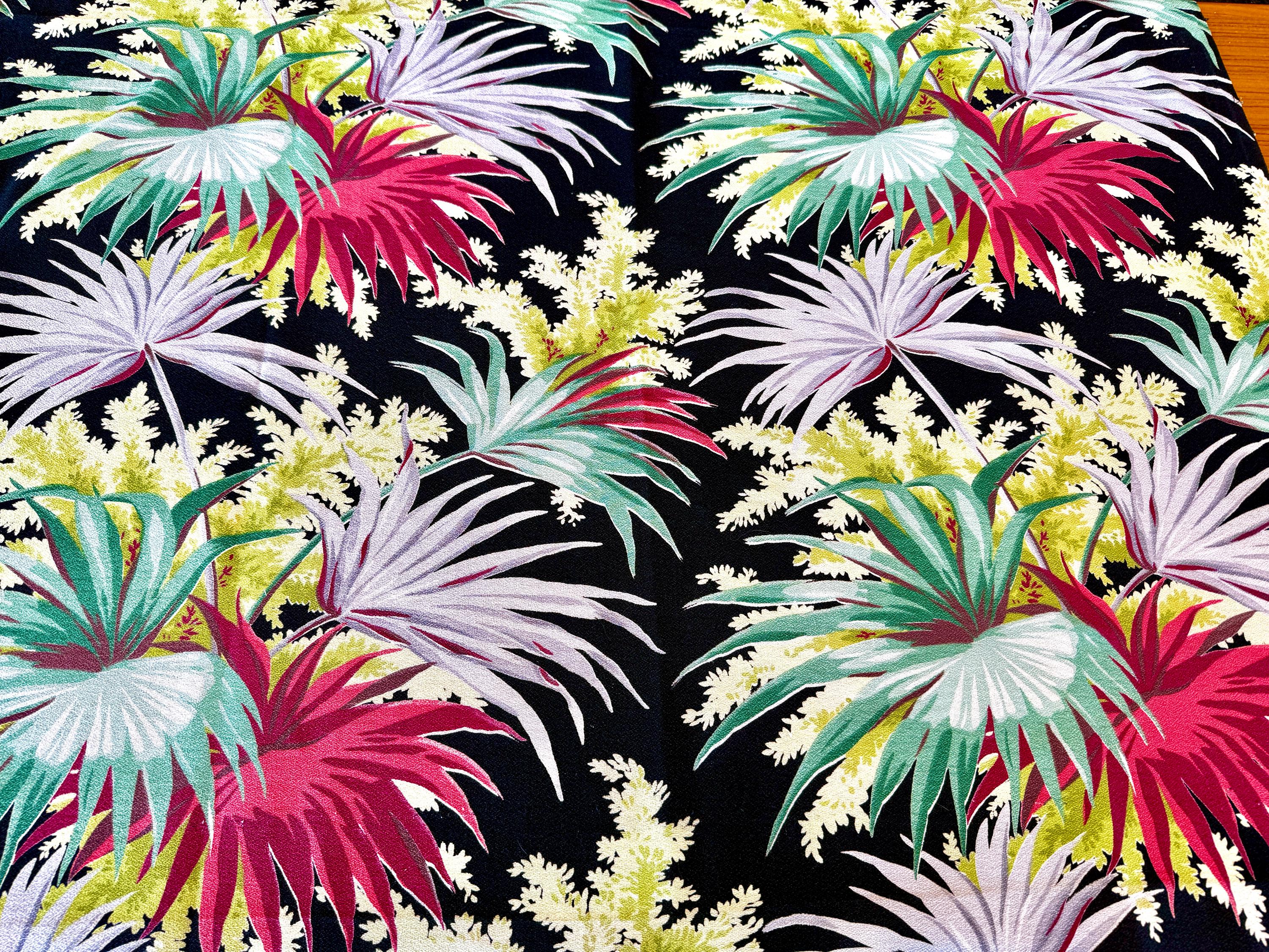 A stark black ground provides the perfect backdrop to display this colorful tropical masterpiece by Waverly Frabrics from the early mid century.