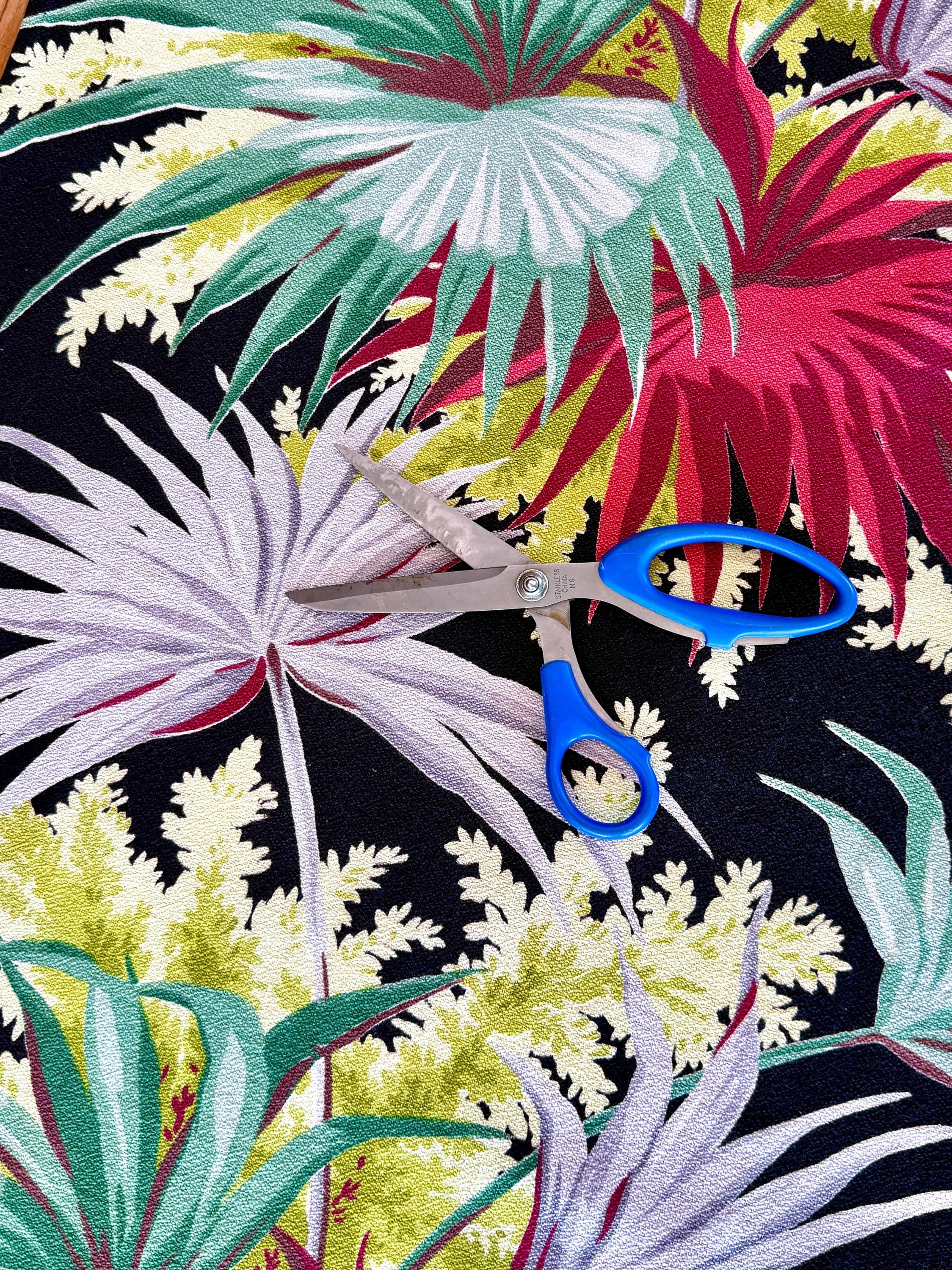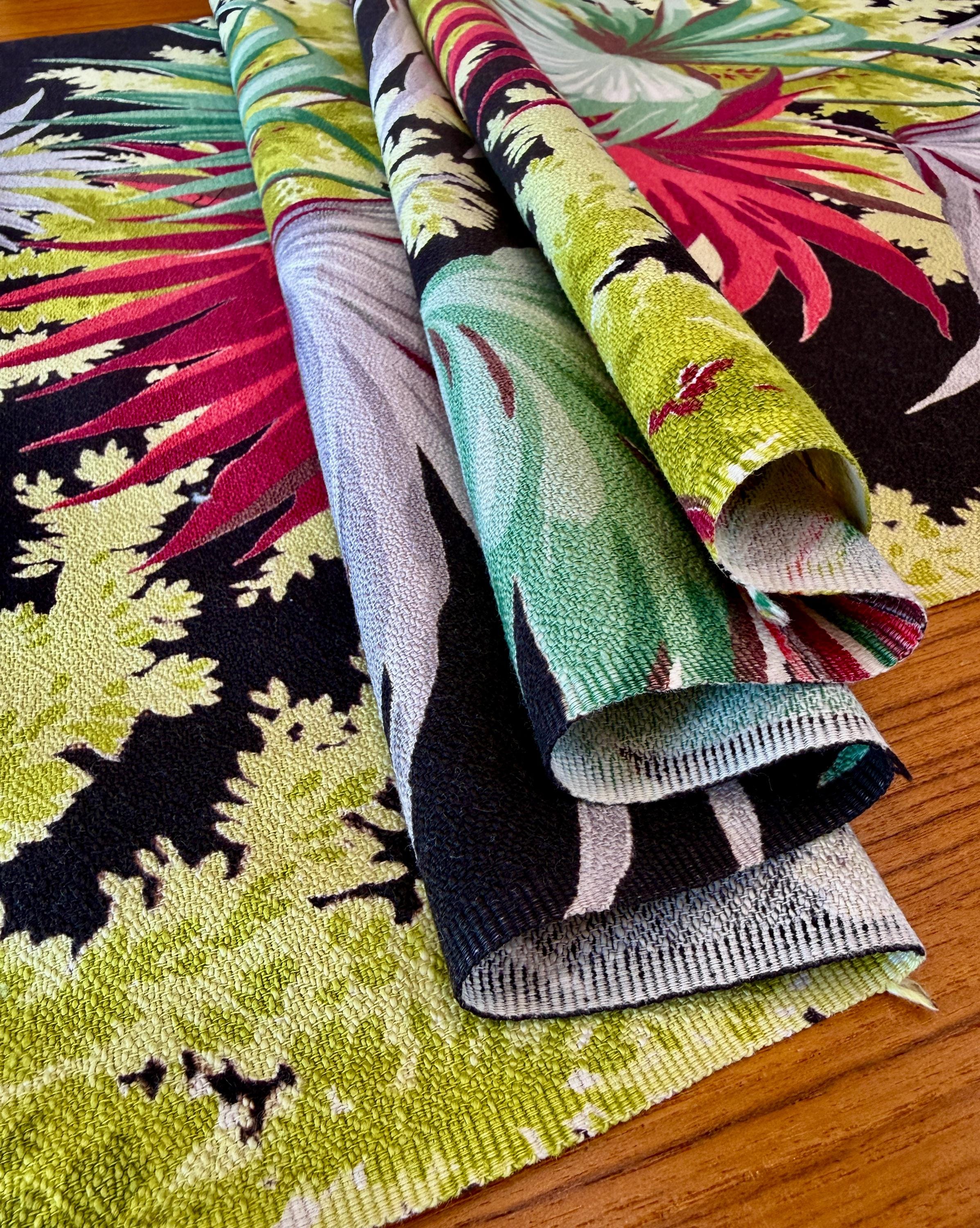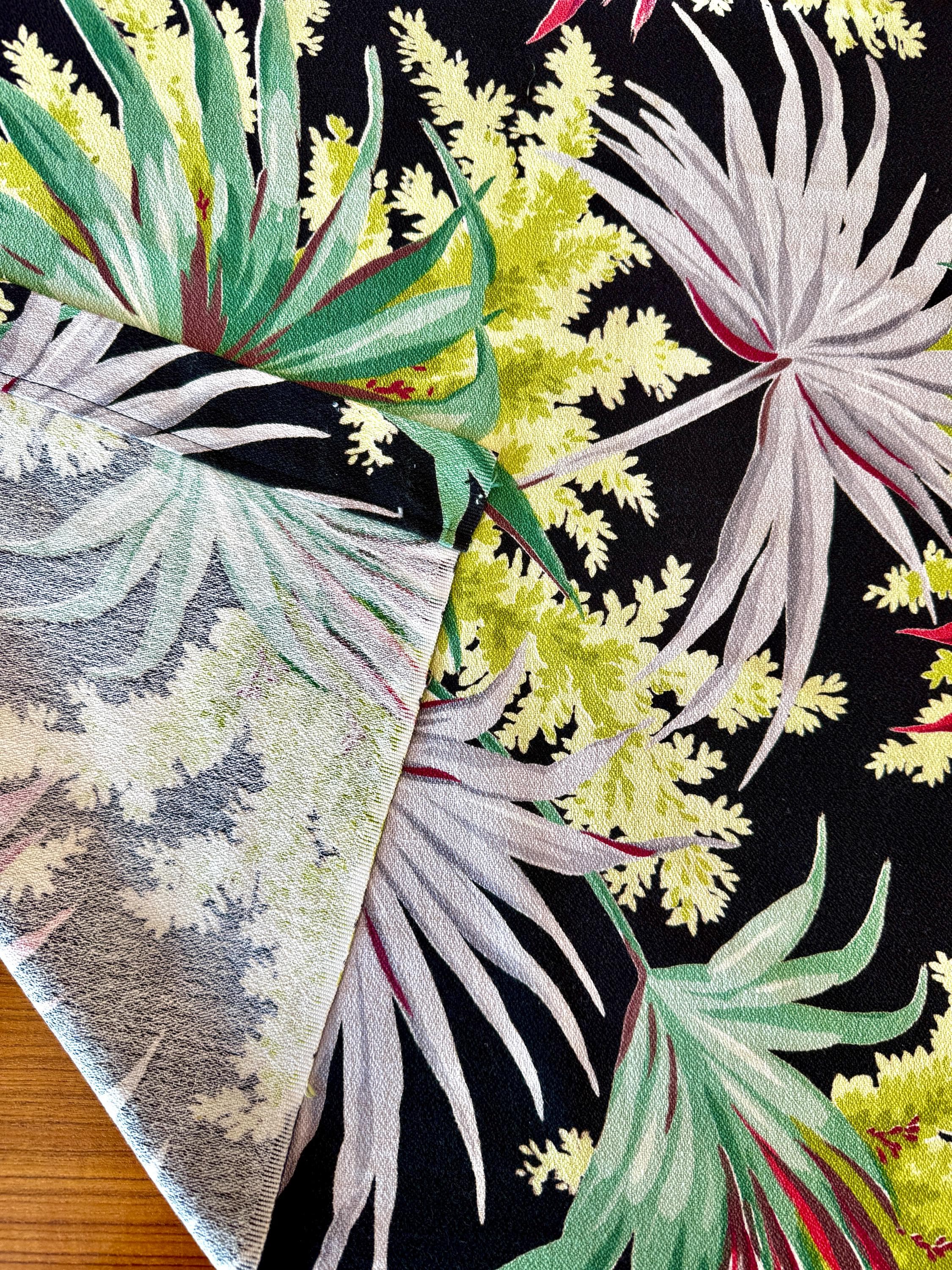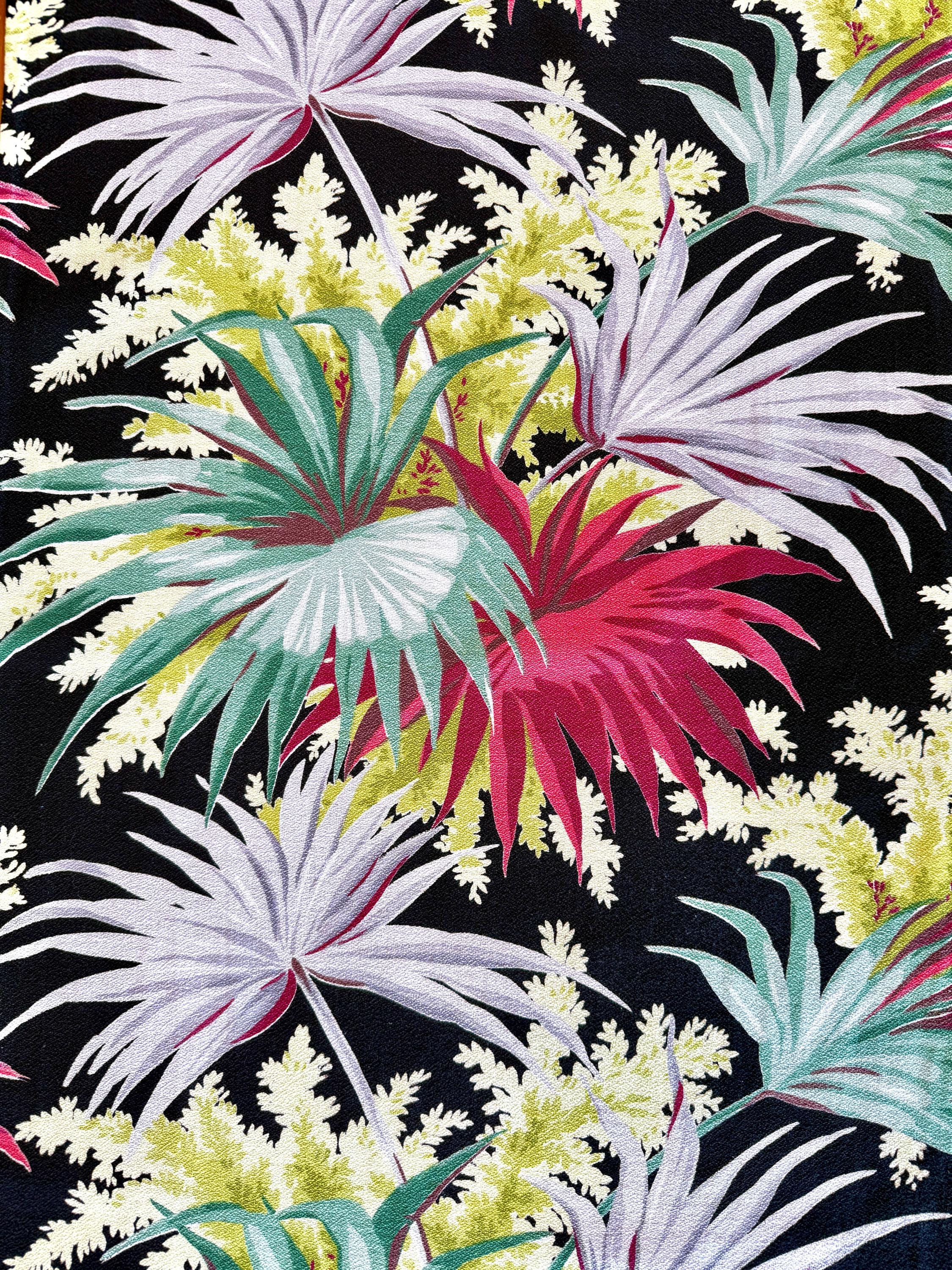 A stark black ground provides the perfect backdrop to display this colorful tropical masterpiece by Waverly Frabrics from the early mid century.