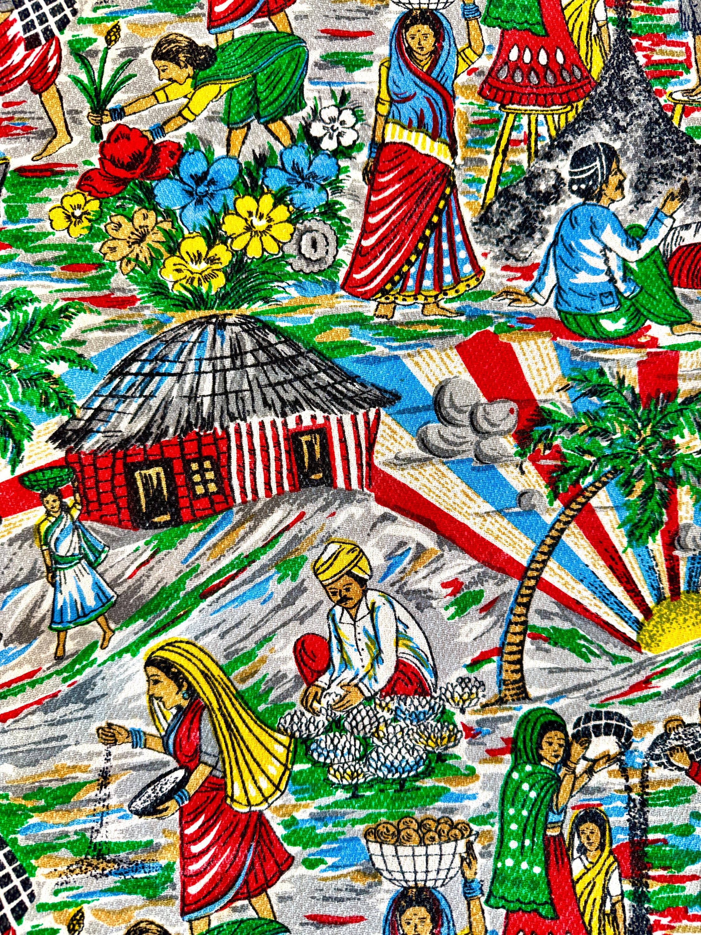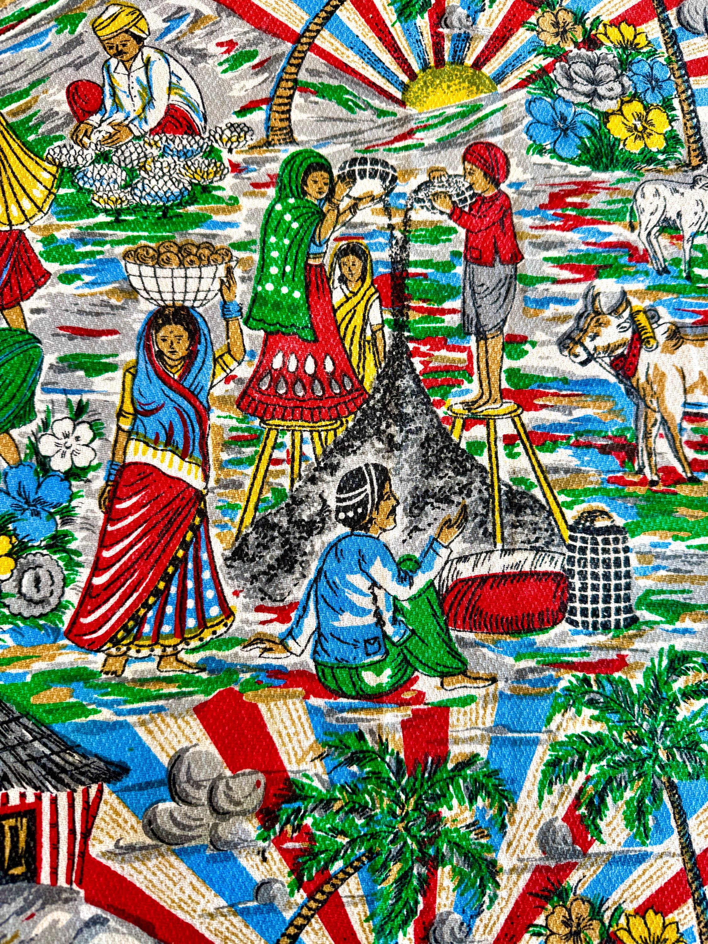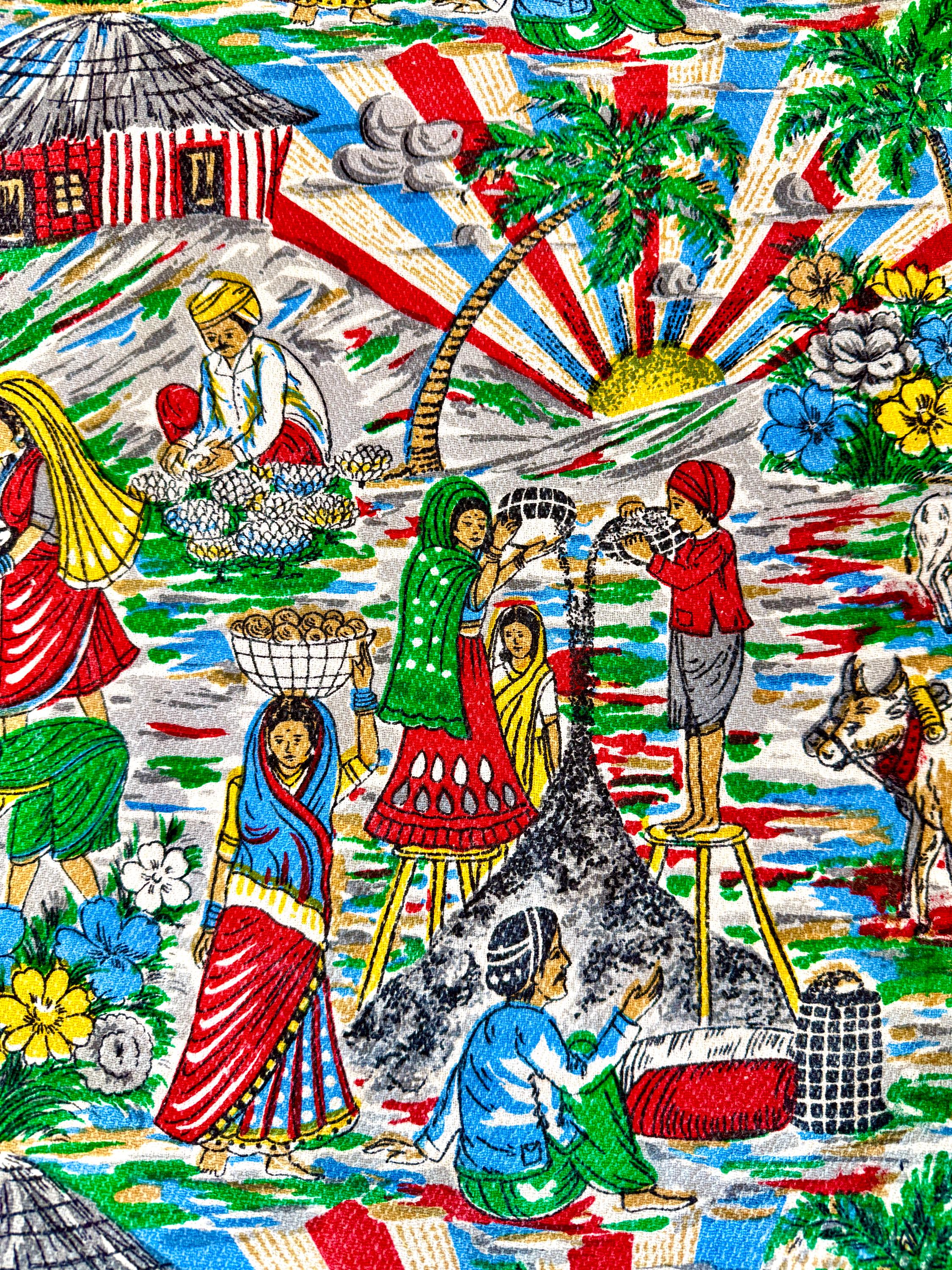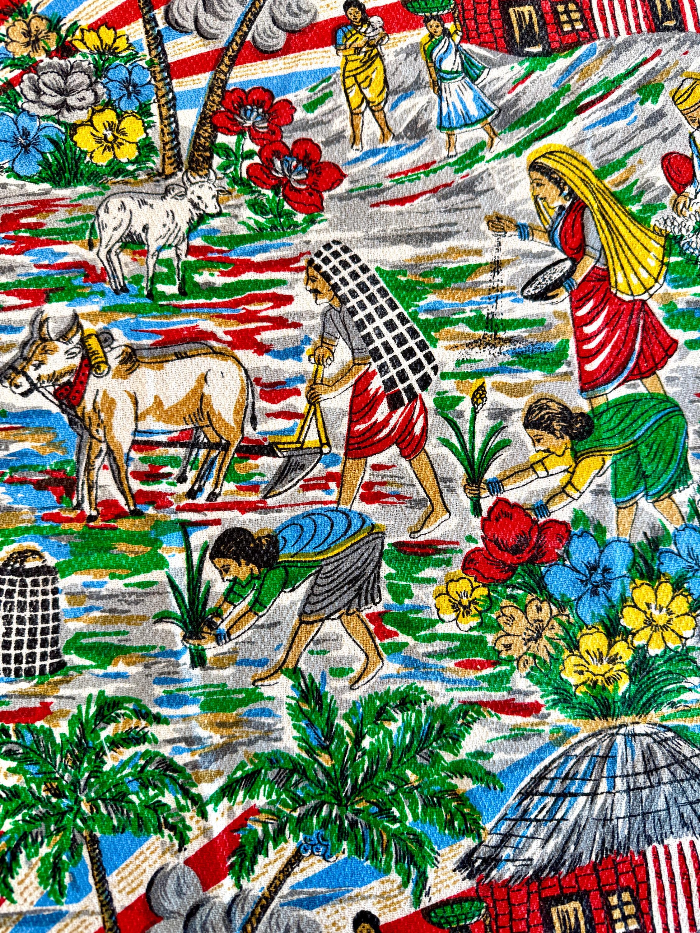 Great vintage barkcloth from the 1970-80s, that does its best to romanticize rural agricultural life in India in the mid 20th century.