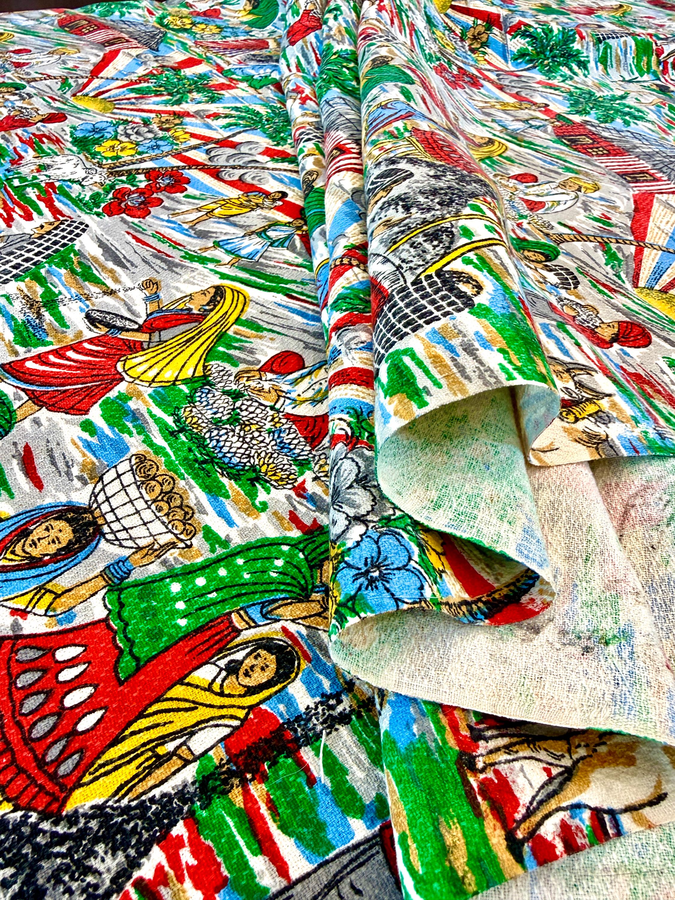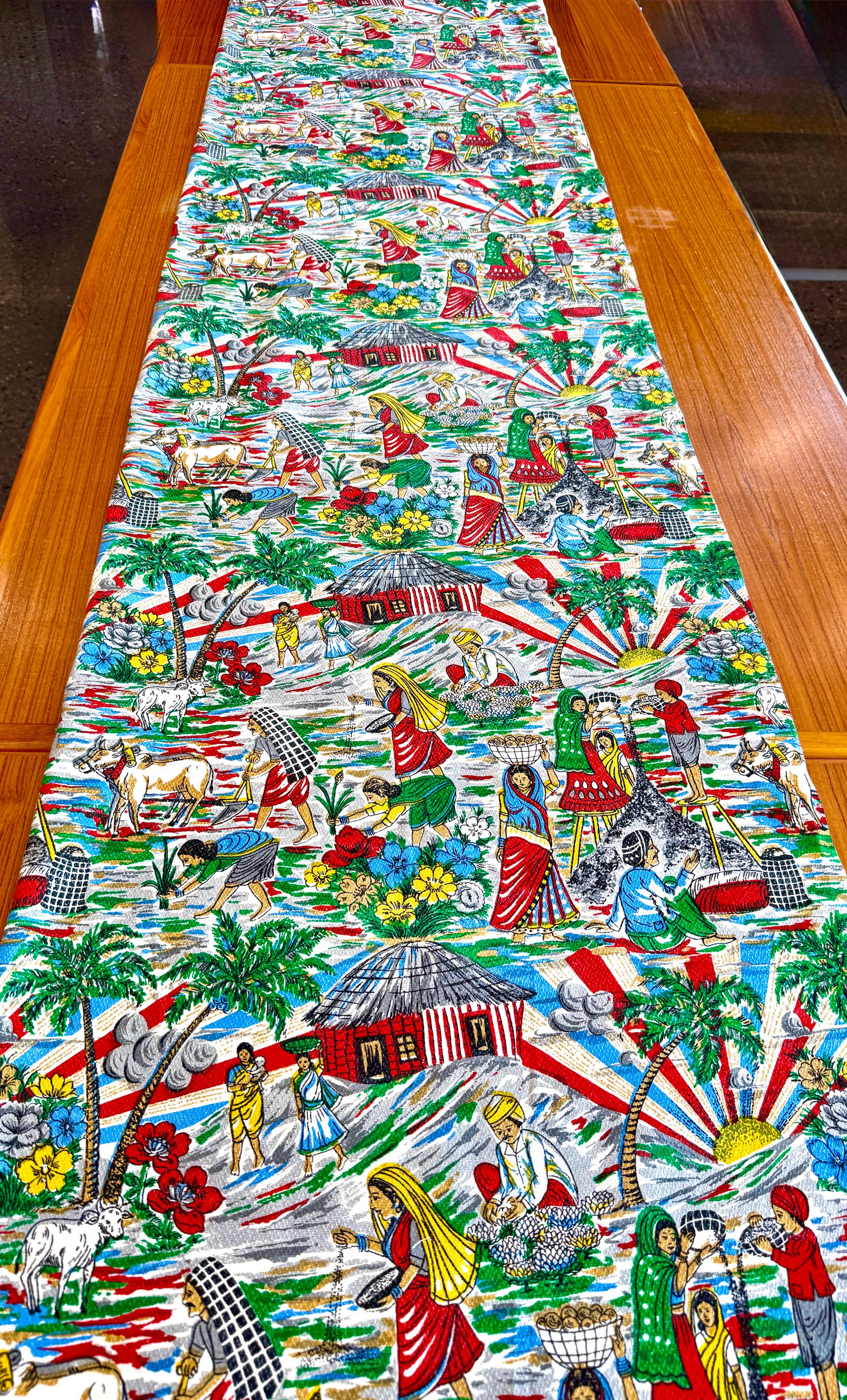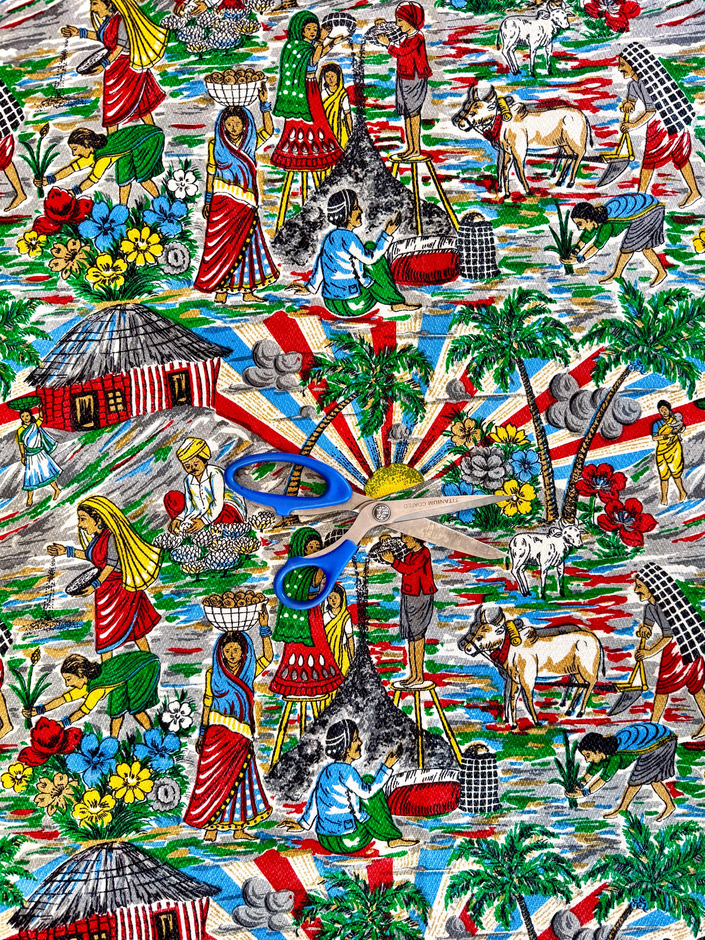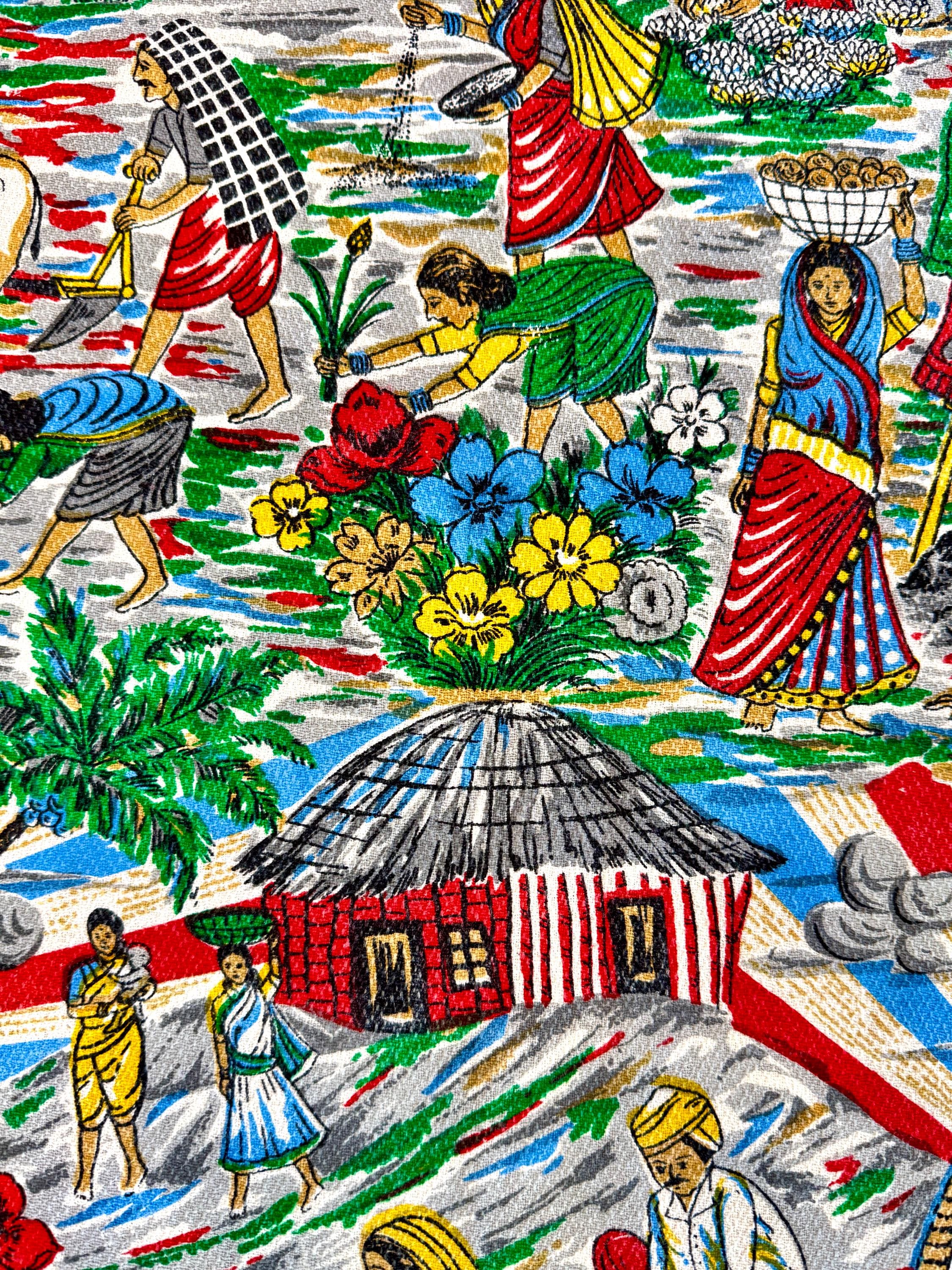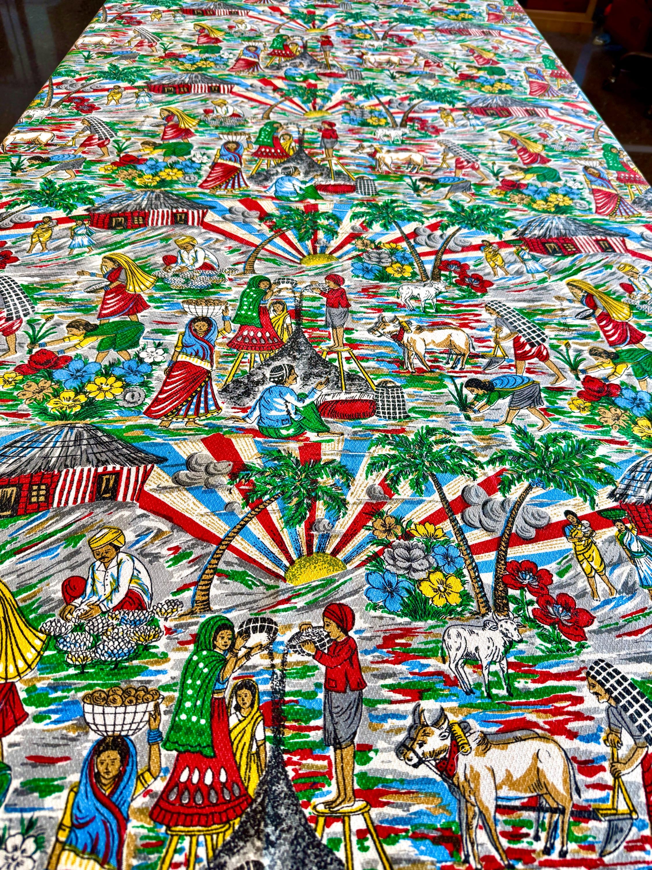 Great vintage barkcloth from the 1970-80s, that does its best to romanticize rural agricultural life in India in the mid 20th century.