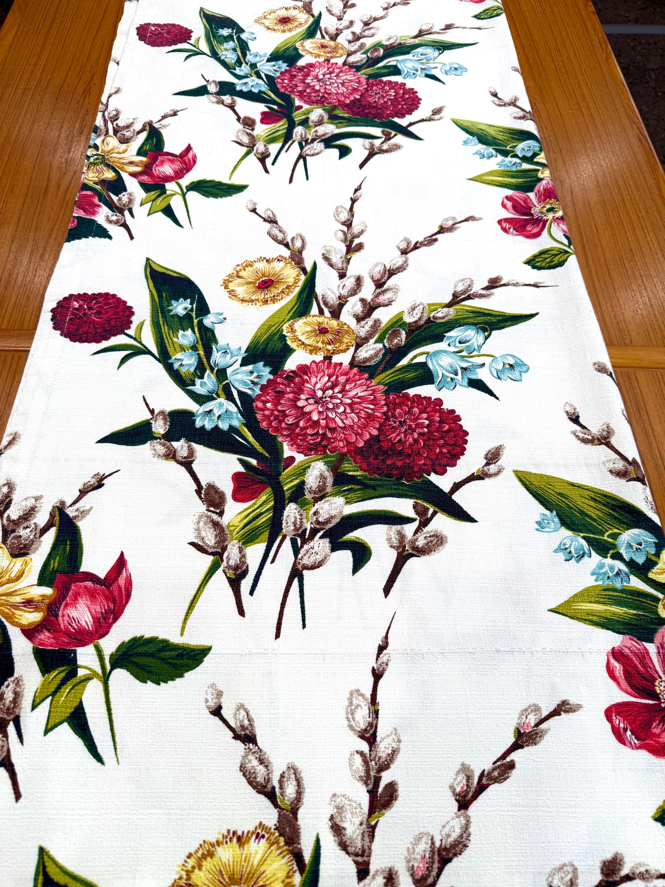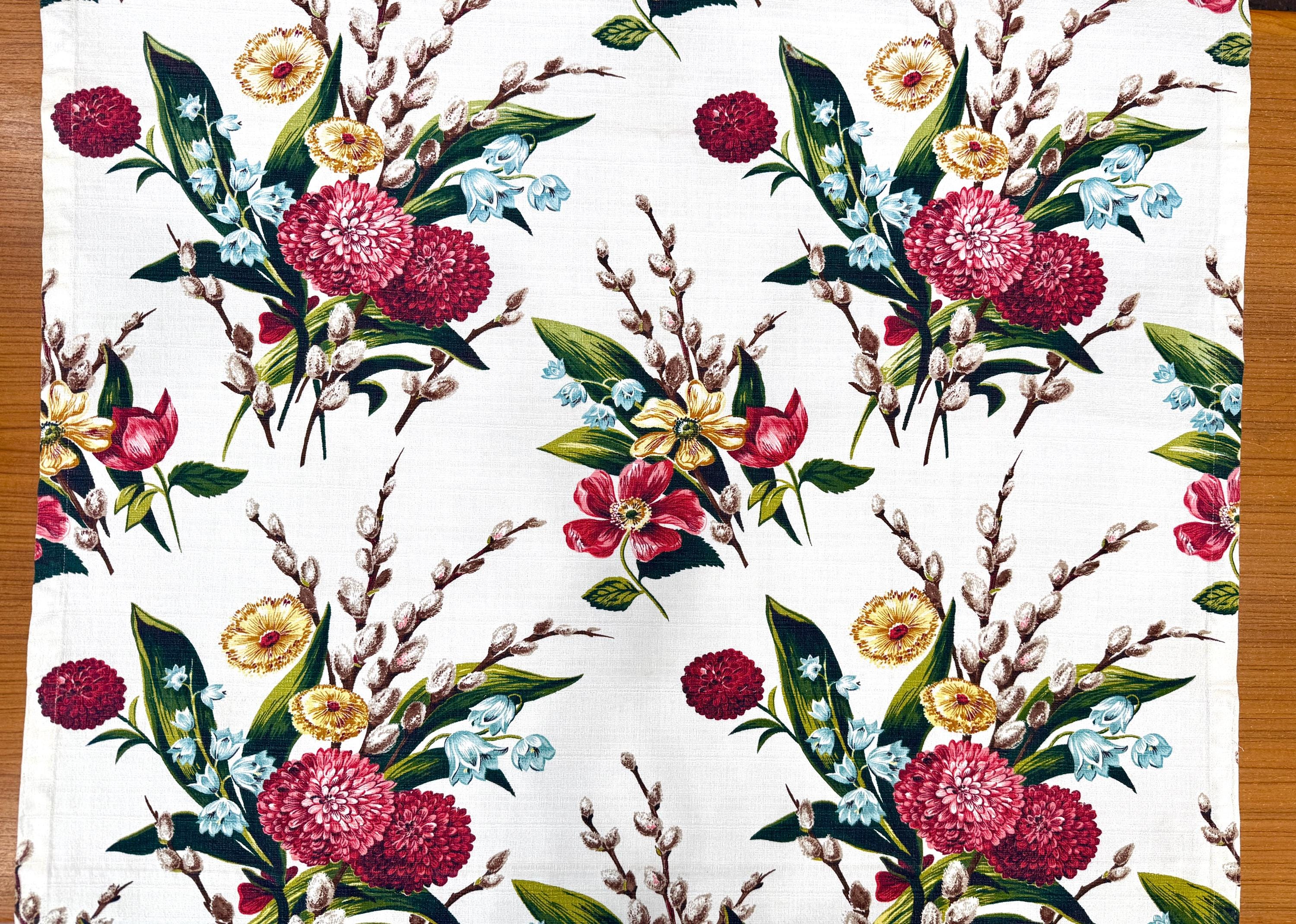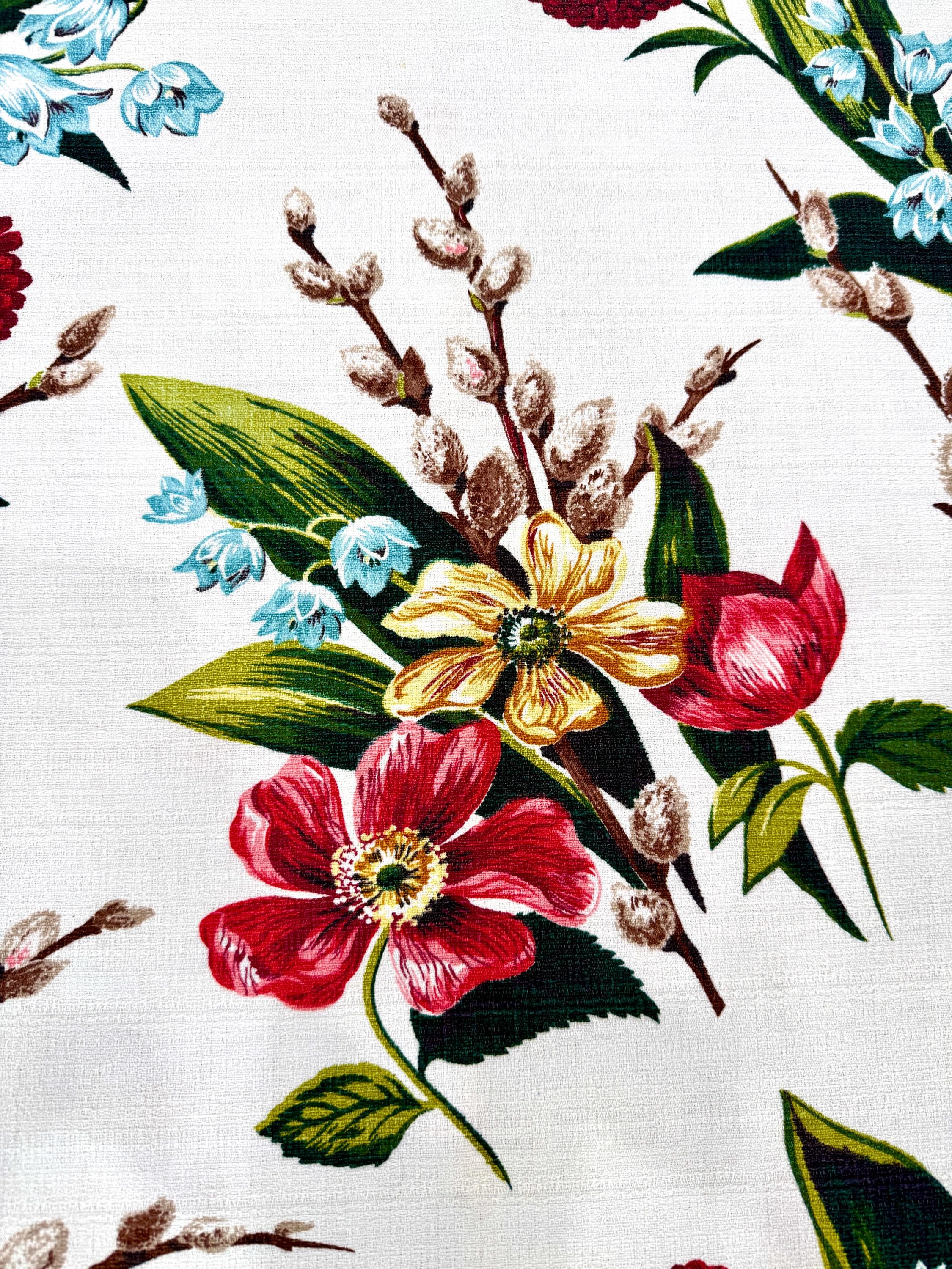 This fabric features a cornucopia of summer blooms, including white, pink, and taupe pussy willows; chrysanthemums in cranberry, red, mustard, and white; bluebells in white and baby blue; and the occasional coral and red tulip. The dark juniper green and chartreuse leaves add interest, as does the nubby texture of the textile, while the stark white ground provides the perfect backdrop for this fab floral masterpiece.