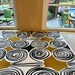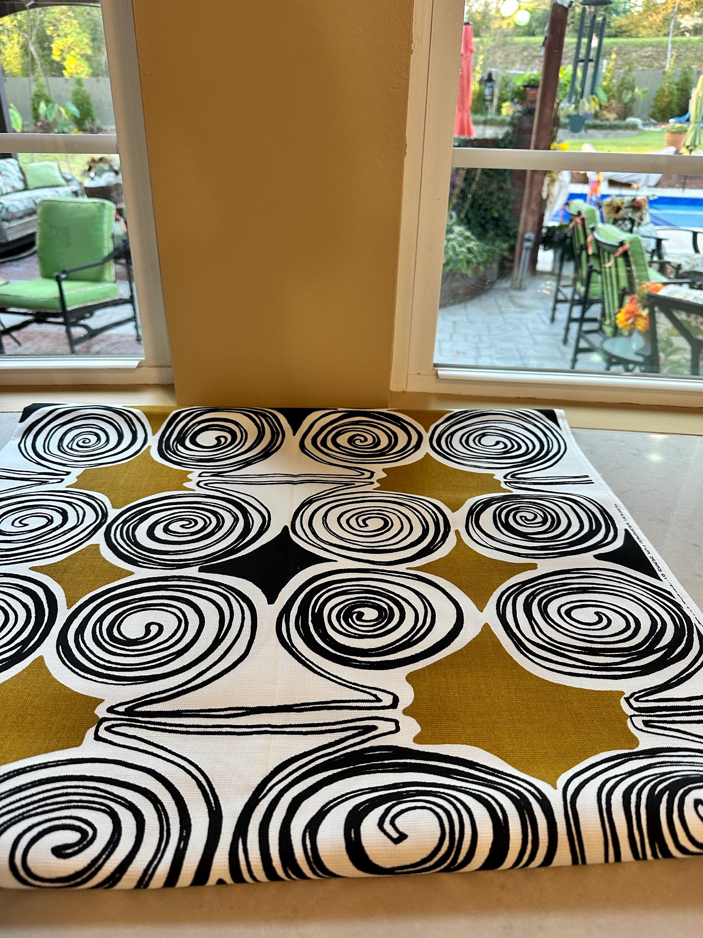Fab geometric spiral shapes in the form of circles, sporting a color palate in black, on a not to be missed, striped background of white and tawny mustard.