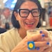 Geometric shapes in sunny yellow, turquoise, red, lime green, chocolate and mocha brown, provide an eye piping backdrop for wild and crazy stylized foliage.