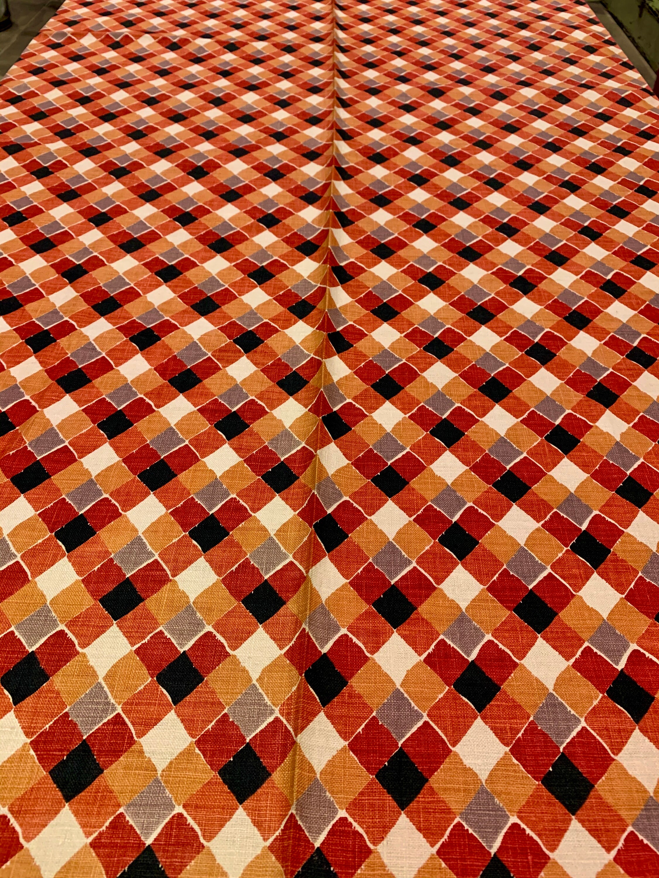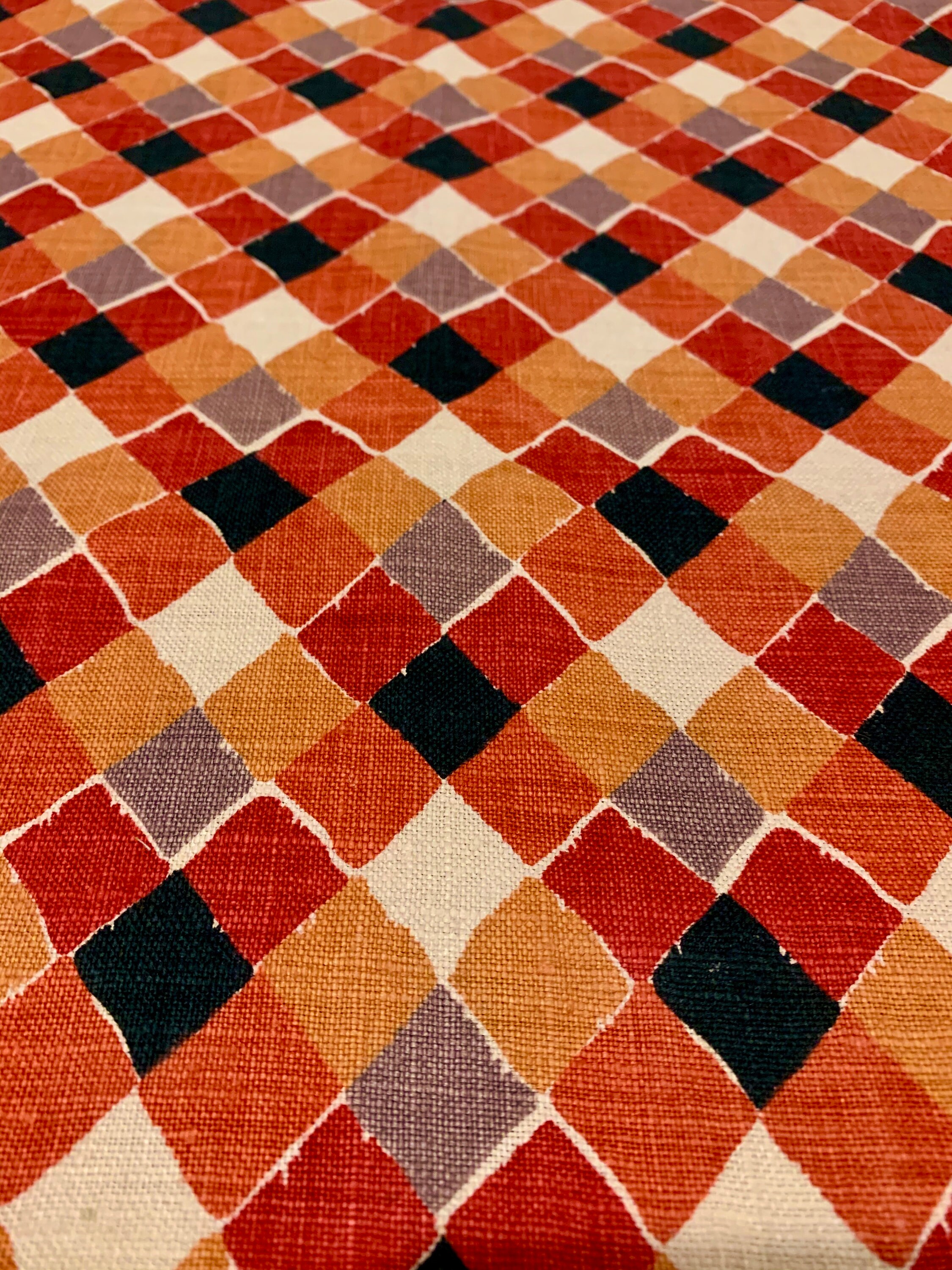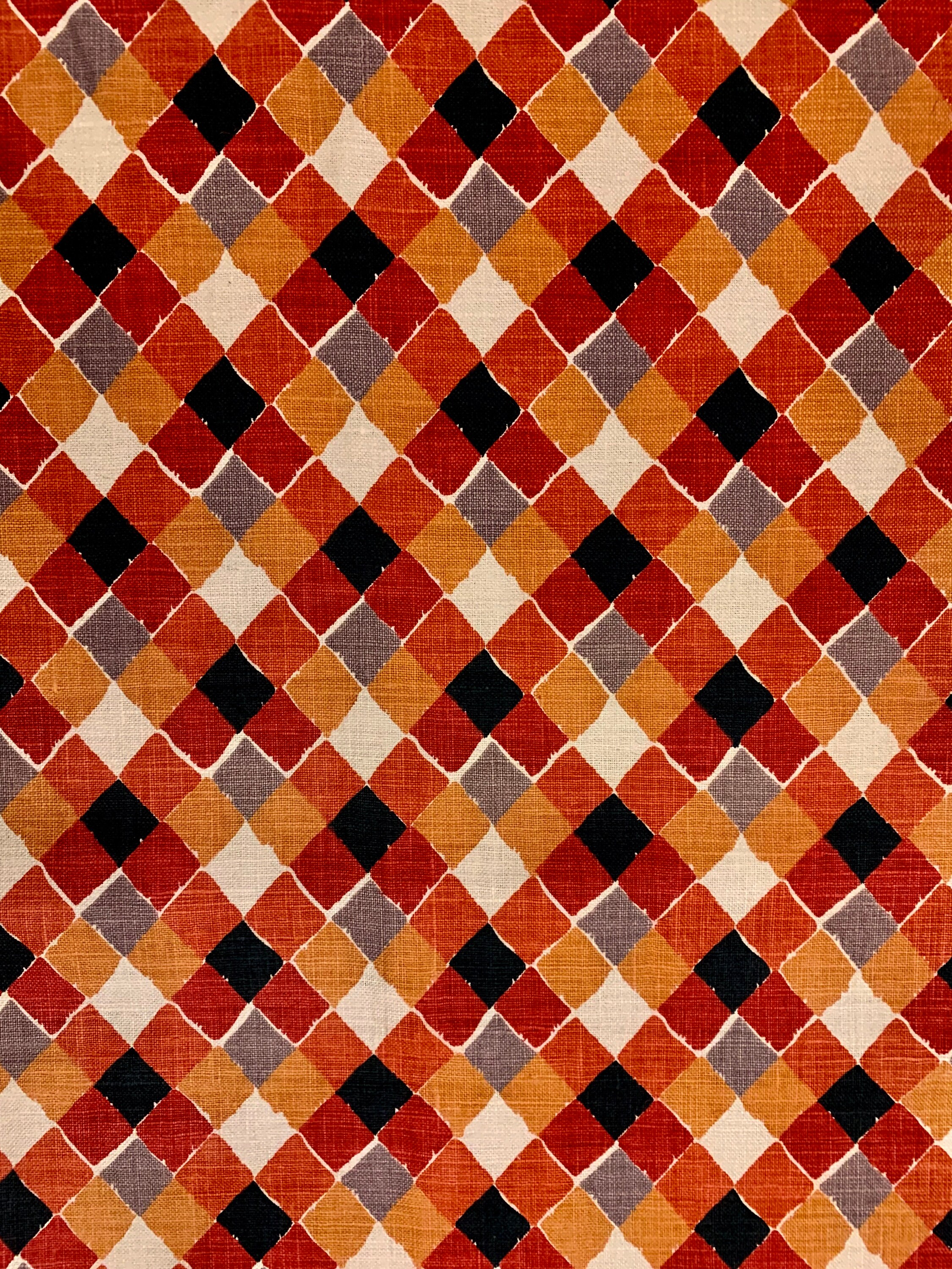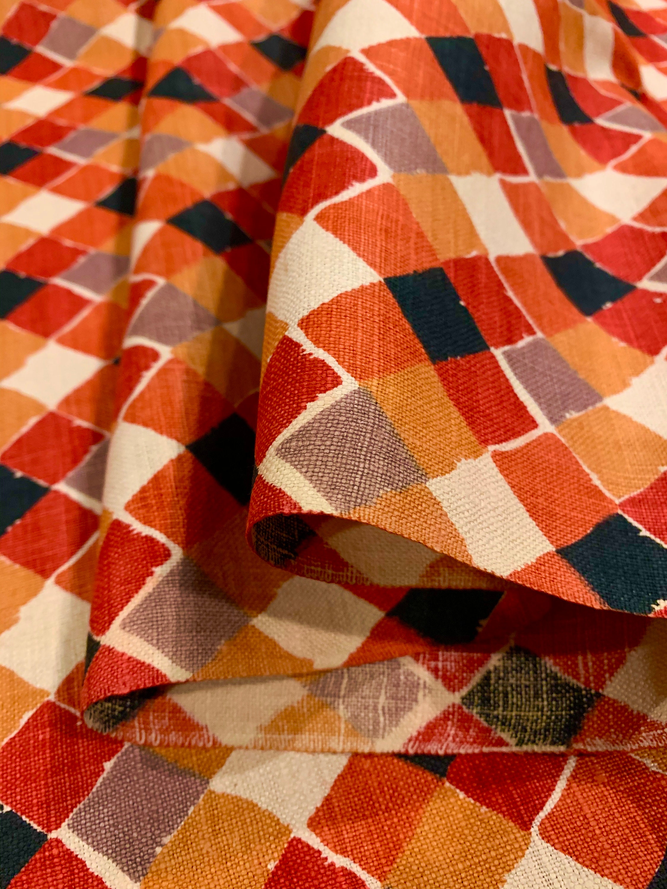 This fabric sports a harlequin-esque design in a vivid color palate you won't soon forget, with a diamond grid pattern, featuring orange, red, melon, black, gray, and white.